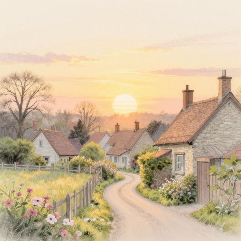 Drawing:ay5n-_datvg= portraying a peaceful rural village at sunset, soft pastel colors combined with gentle pencil sketches illustrate quaint cottages, winding paths, and blooming gardens enveloped in warm golden light