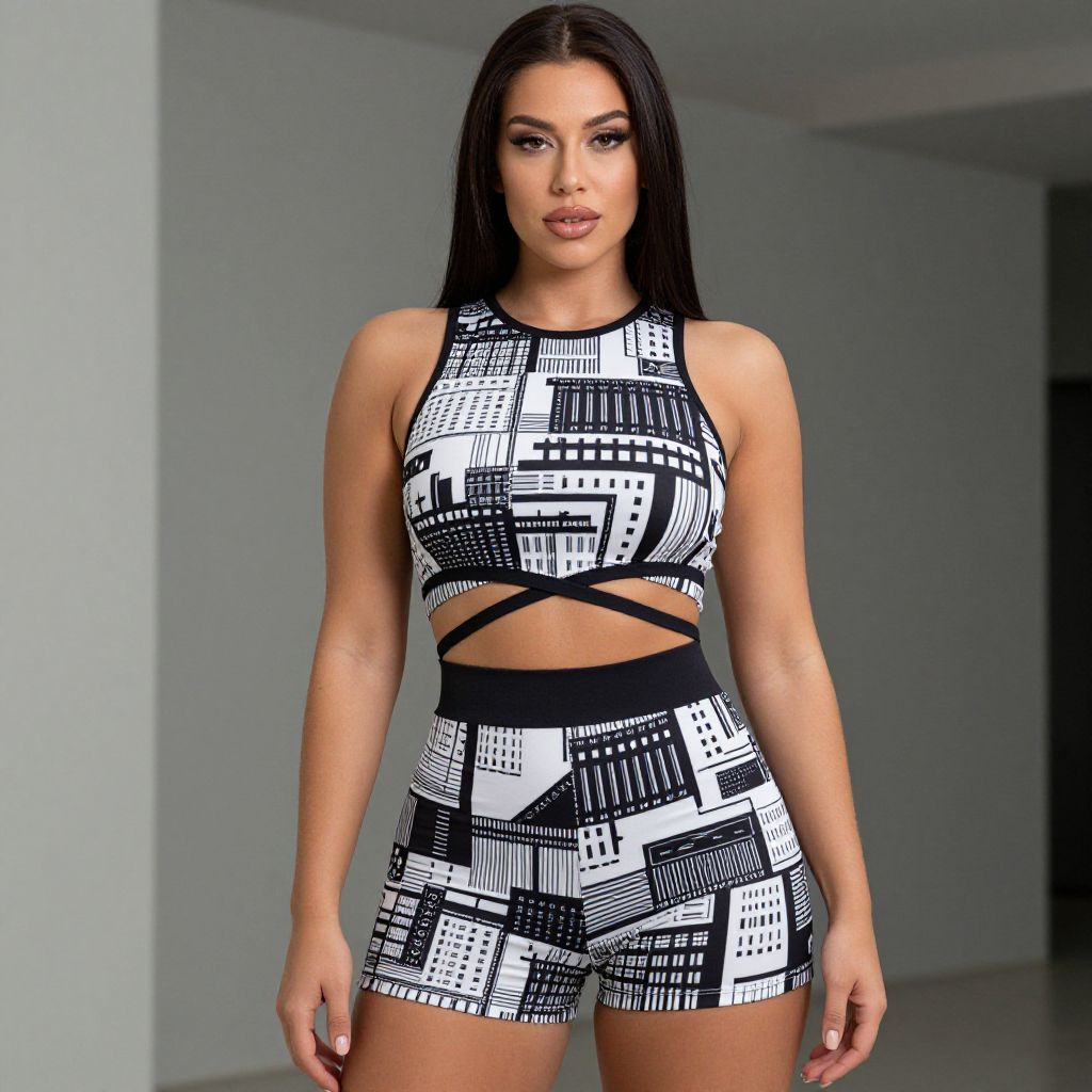 "Woman, modern urban, geometric print crop top with crisscross waistband in black and white, high neckline, sleeveless, matching high-waisted shorts, form-fitting.. Sexy. Pretty face and beаutiful eyes. Big breasts."