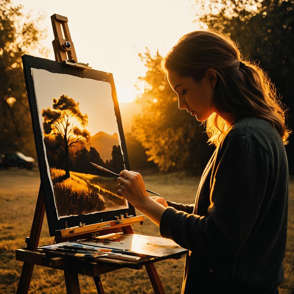A golden hour glow enhancing an artist painting outdoors against the warm amber light, creating a captivating scene.