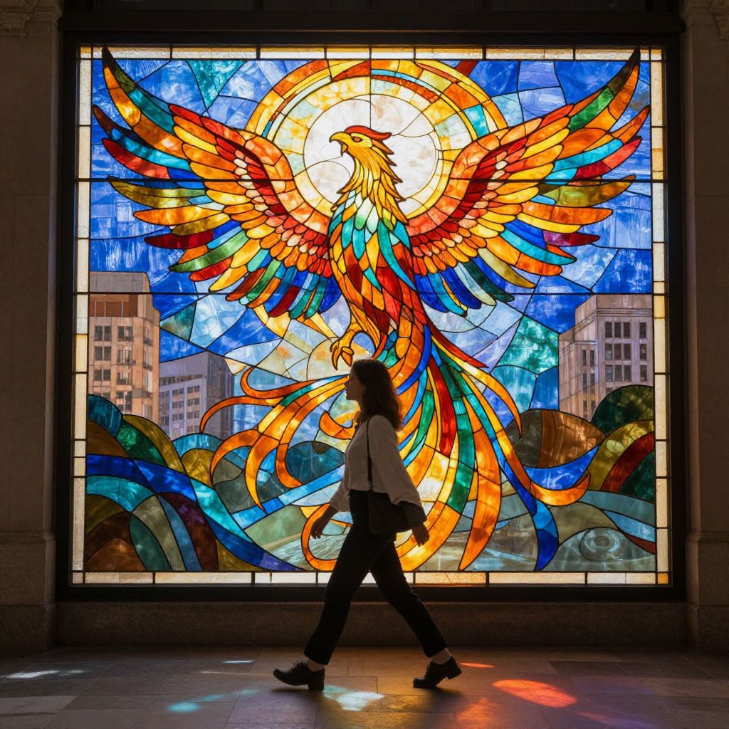 In a vibrant urban symphony, a woman walks beneath a sentient stained-glass phoenix, its fiery wings casting a kaleidoscope of shadows that dance with the rhythm of hope and transformation, weaving a narrative of freedom and transcendence.