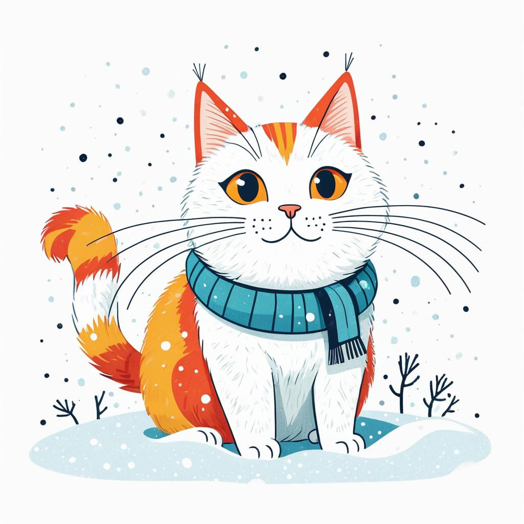 Cartoonish, whimsical style digital illustration of a cute orange and white cat sitting in the snow. The scene is filled with bright, simple shapes and colorful dots on a white backdrop, evoking a playful and cheerful winter atmosphere.