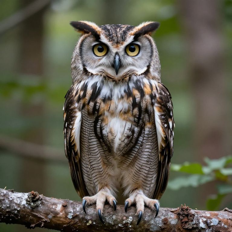 Photograph of a Great Gray Owl perched on a branch in a forest. The owl has striking yellow eyes, a white face with black and brown streaks, and a buff-colored chest with dark gray and brown feather patterns. Its wings are adorned with black, white, and brown markings. The background is a blurred mix of green and brown, indicating dense foliage. The owl's talons grip the textured, lichen-covered branch firmly. The image is sharply focused on the owl, highlighting its detailed plumage and intense gaze.