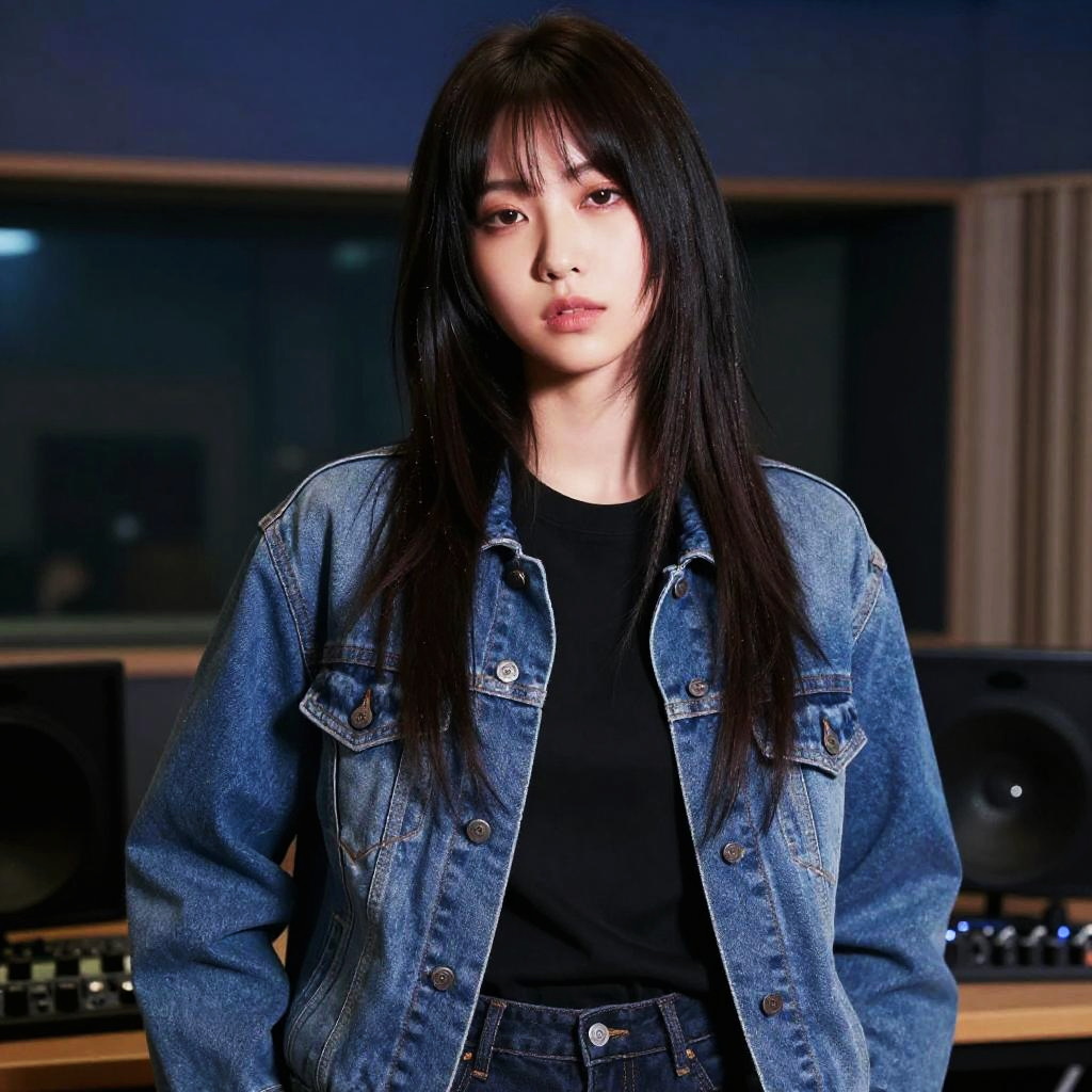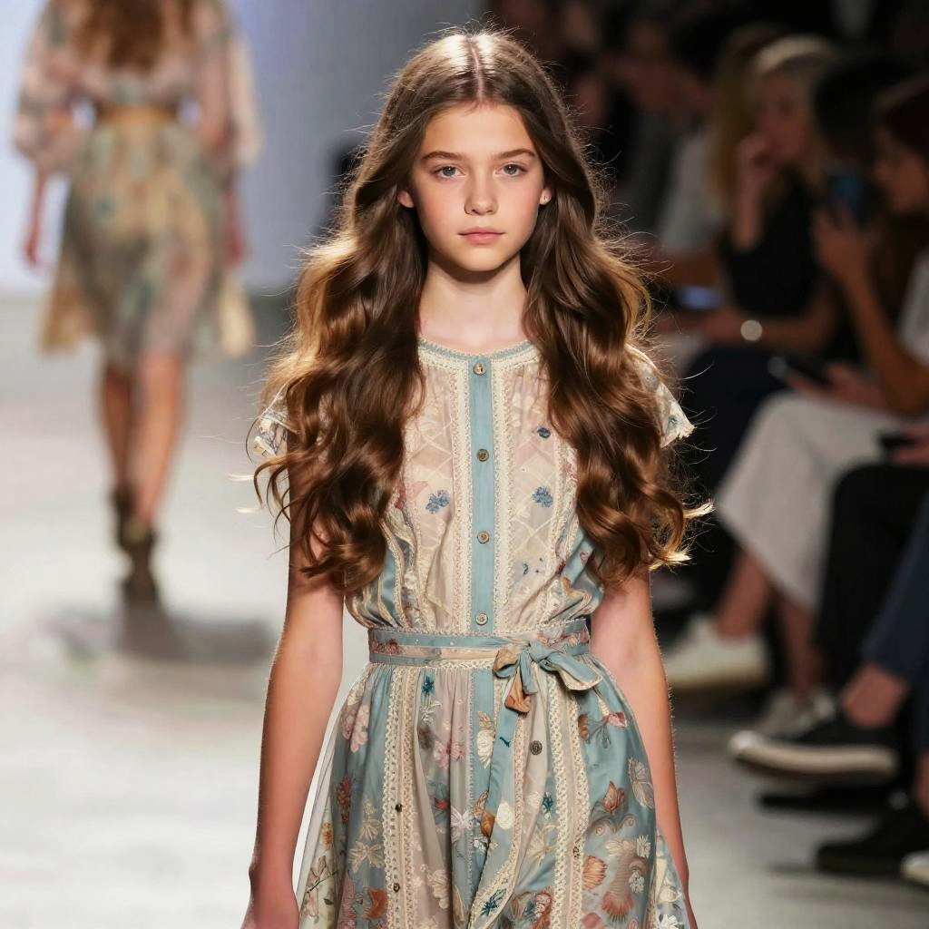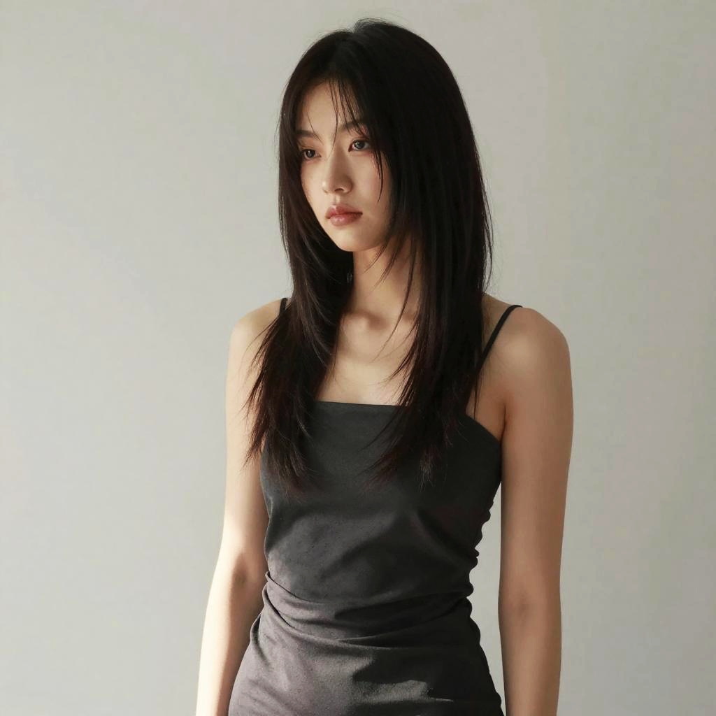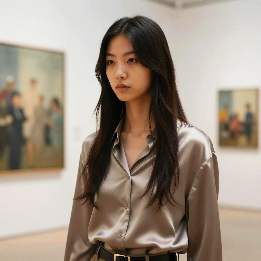 Long Layers hairstyle on runway model, wearing asymmetrical avant-garde dress, in modern art museum, captured in fashion editorial style with cool white spotlight.