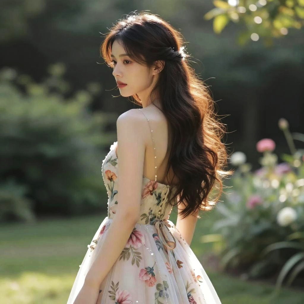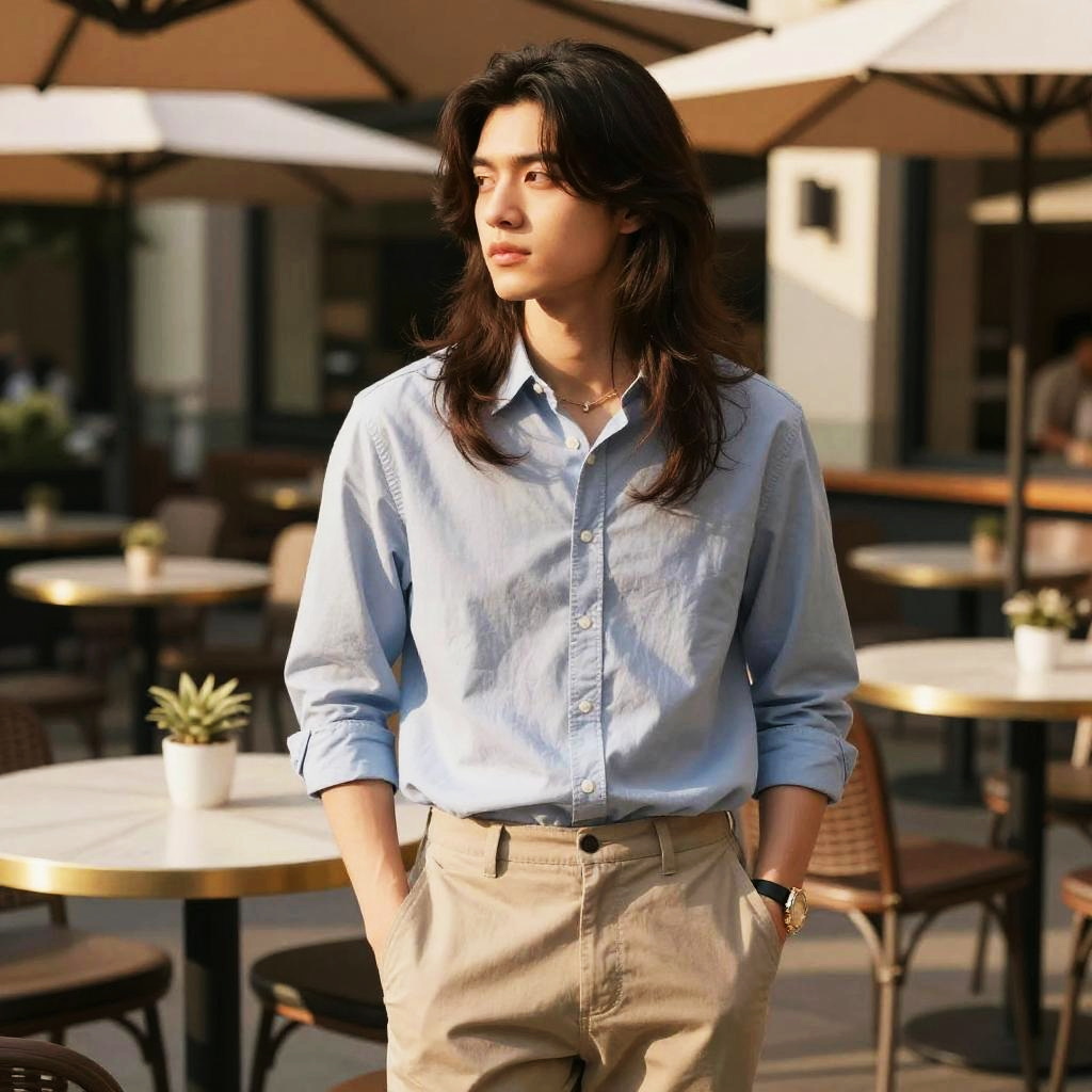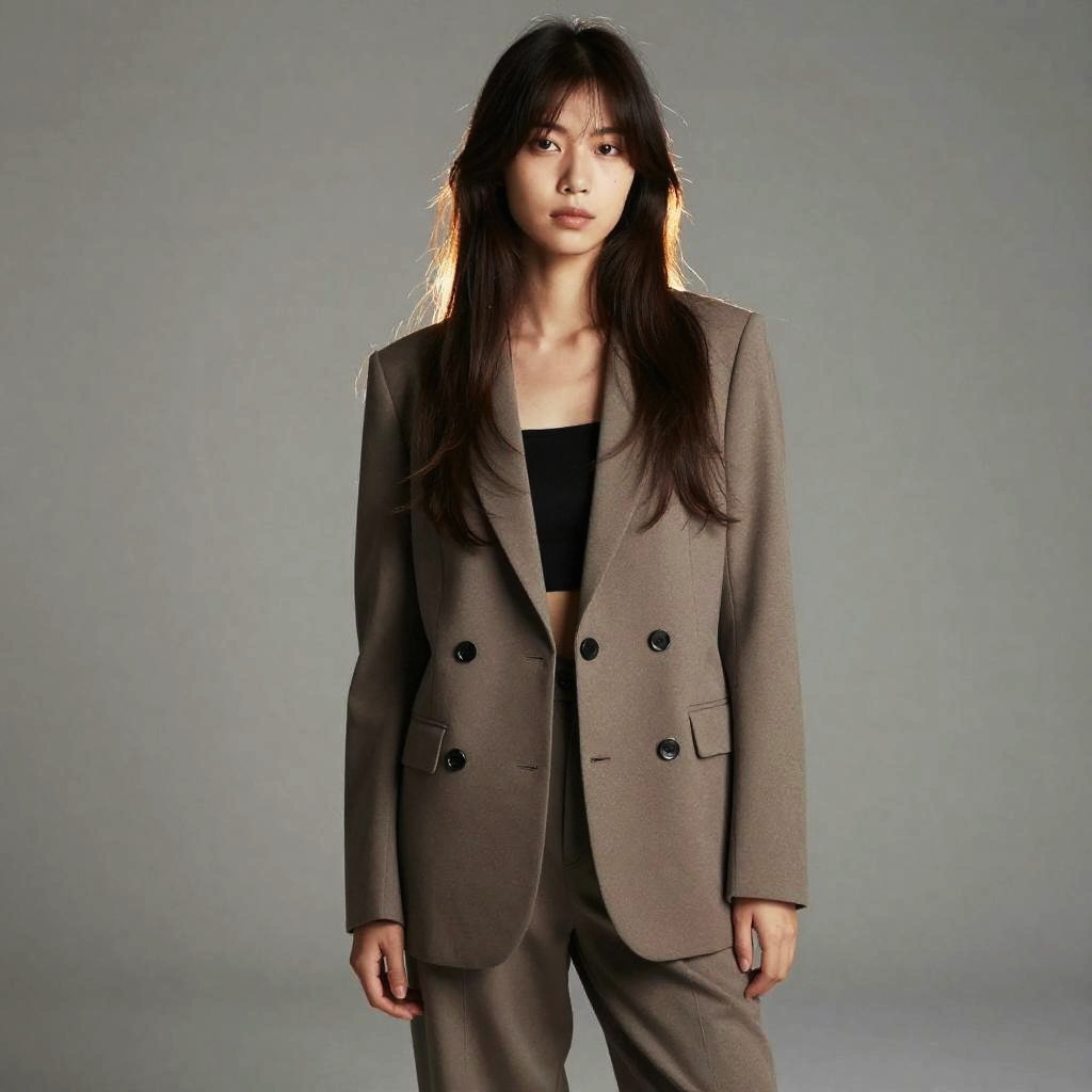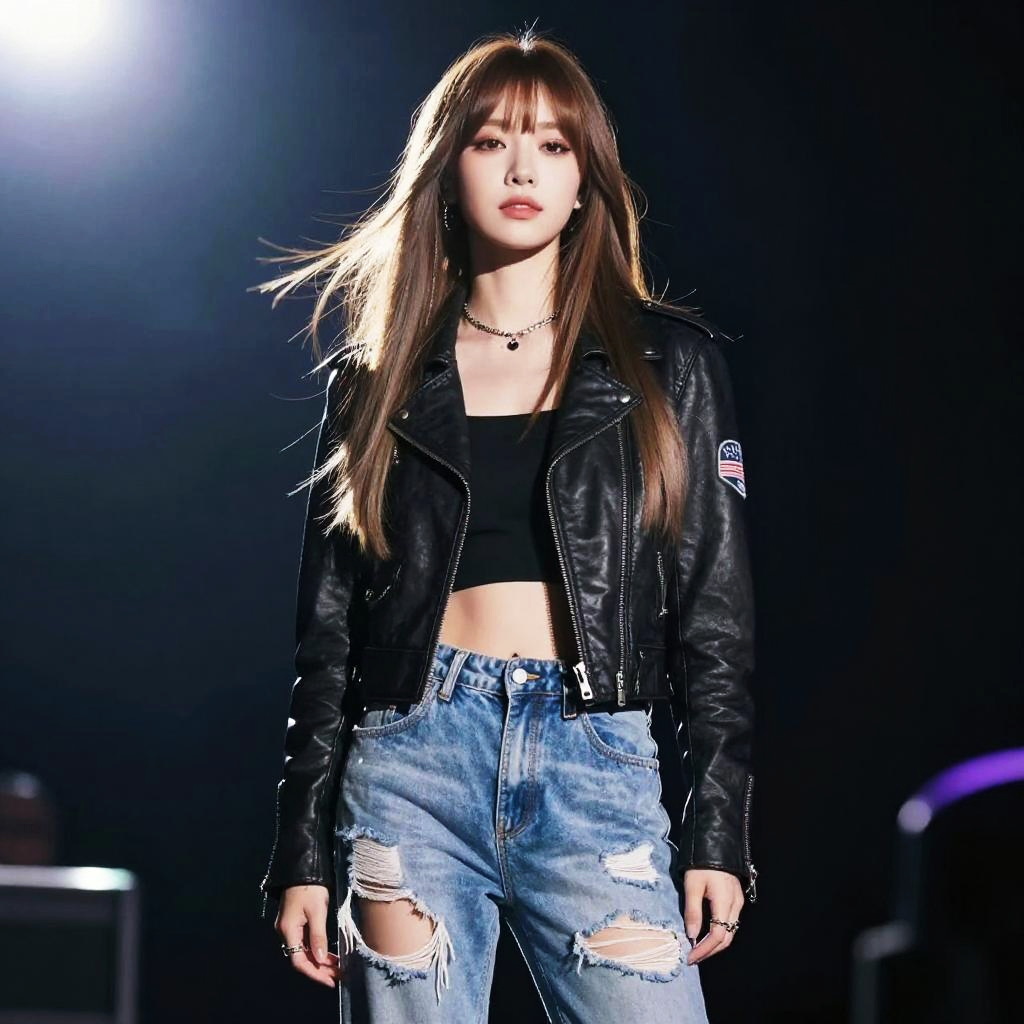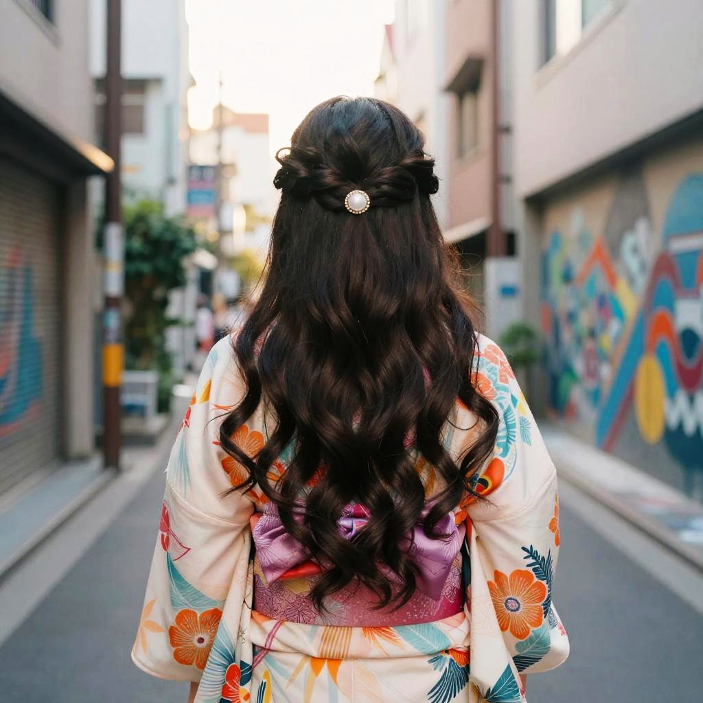 Long Layers hairstyle on runway model, wearing asymmetrical avant-garde dress, in modern art museum, captured in fashion editorial style with cool white spotlight.