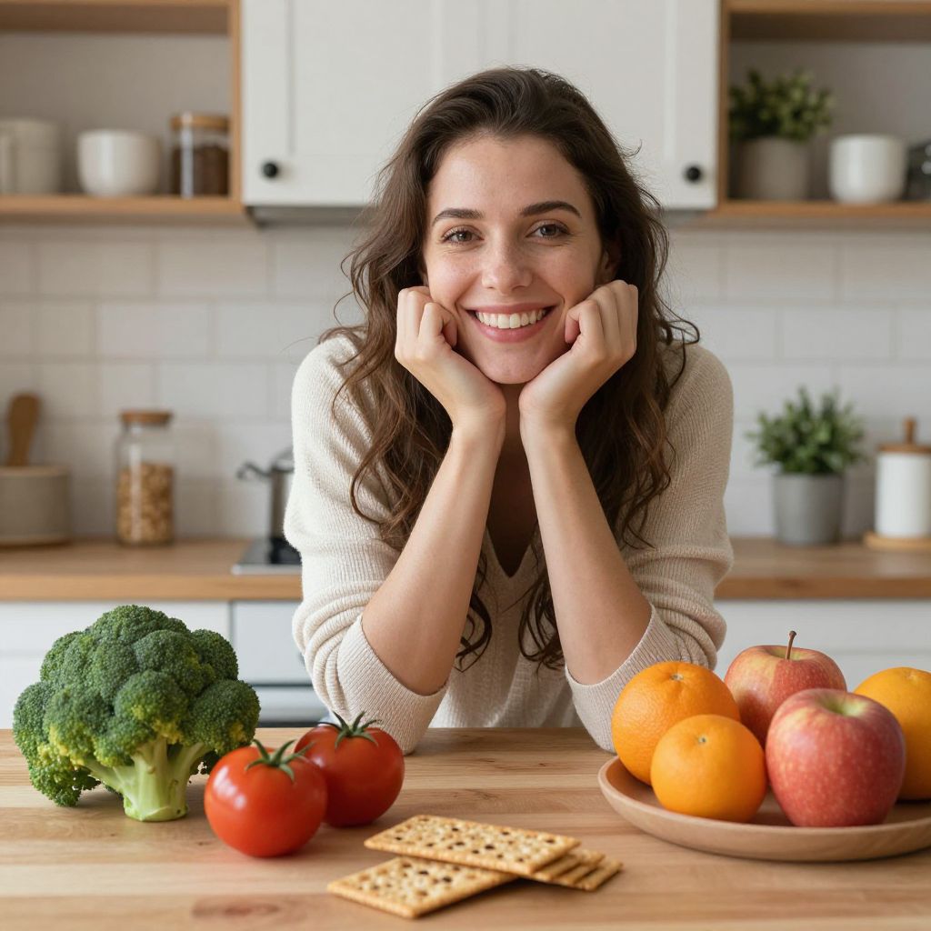 Woman smiling warmly in a cozy kitchen setting, surrounded by fresh produce including broccoli, tomatoes, oranges, apples, and crackers neatly arranged on wooden countertops, embodying a healthy lifestyle.