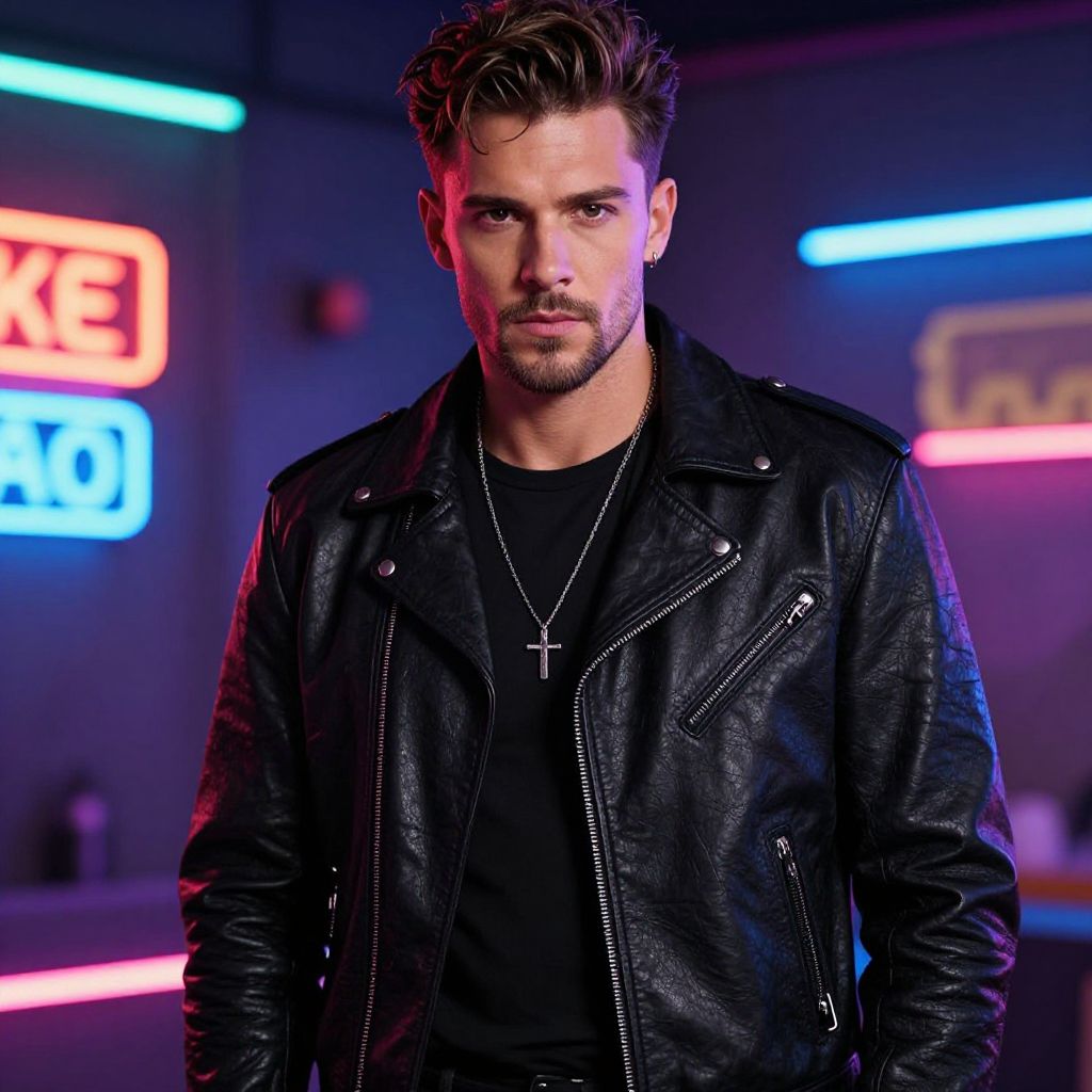 Photograph of a handsome, dark-haired man in a black leather jacket, white tee, ripped jeans, and black boots, standing in a sunlit