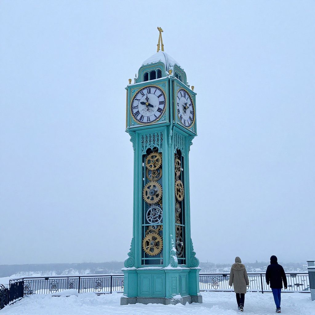 Snow-covered clock tower stands tall in a serene winter scene, its turquoise structure adorned with intricate mechanical gears and dual Roman numeral clocks, while two figures walk along the snow-lined path beneath a pale blue sky.