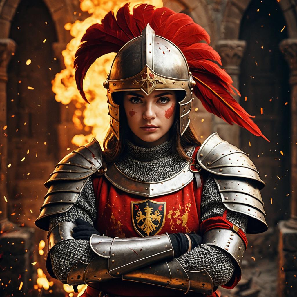 Portrait of a medieval female knight wearing traditional steel armor and a red plume helmet. The knight has expressive eyes, chainmail sleeves, and a red tunic with a golden crest. The background features a fiery ambiance with sparks and blurred stone arches, creating a dramatic and artistic medieval scene.