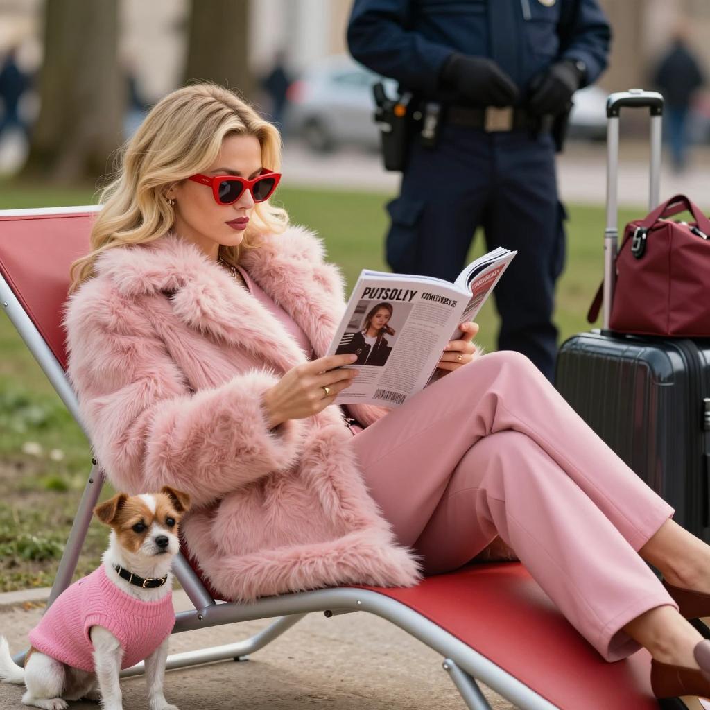 Photograph of a blonde woman in a bright pink leather jacket and pink sunglasses, smiling widely. She holds a small tan and white Chihuahua in her left arm. Background is blurry with snowy trees. She raises her right hand.