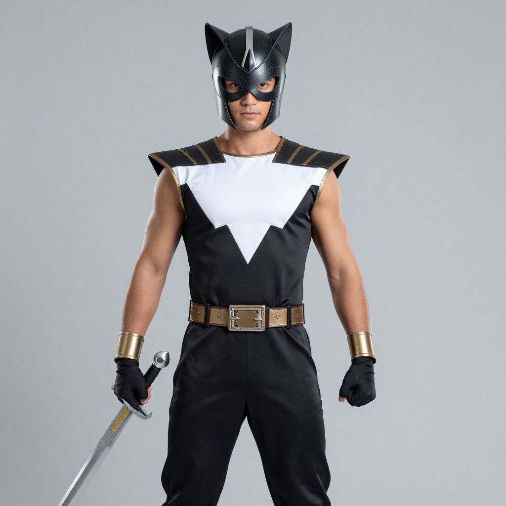 Photograph of a muscular man in a superhero costume standing against a plain light gray background. He wears a black helmet with cat-like ears, a black sleeveless top with a white triangular chest emblem, black pants, and black gloves. His outfit is accessorized with a brown belt with a gold buckle and gold wristbands. He holds a silver sword with a black hilt in his right hand, which rests at his side. His expression is serious, and he stands with a confident posture. The costume's design is sleek and modern.