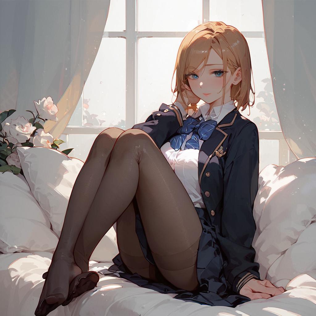 Fate, score_9, score_8_up, score_7_up, source_anime, 1girl, solo, cowboy_shot, smile, school_uniform, classroom, wariza, knees_together_feet_apart, light_blush, summer_uniform