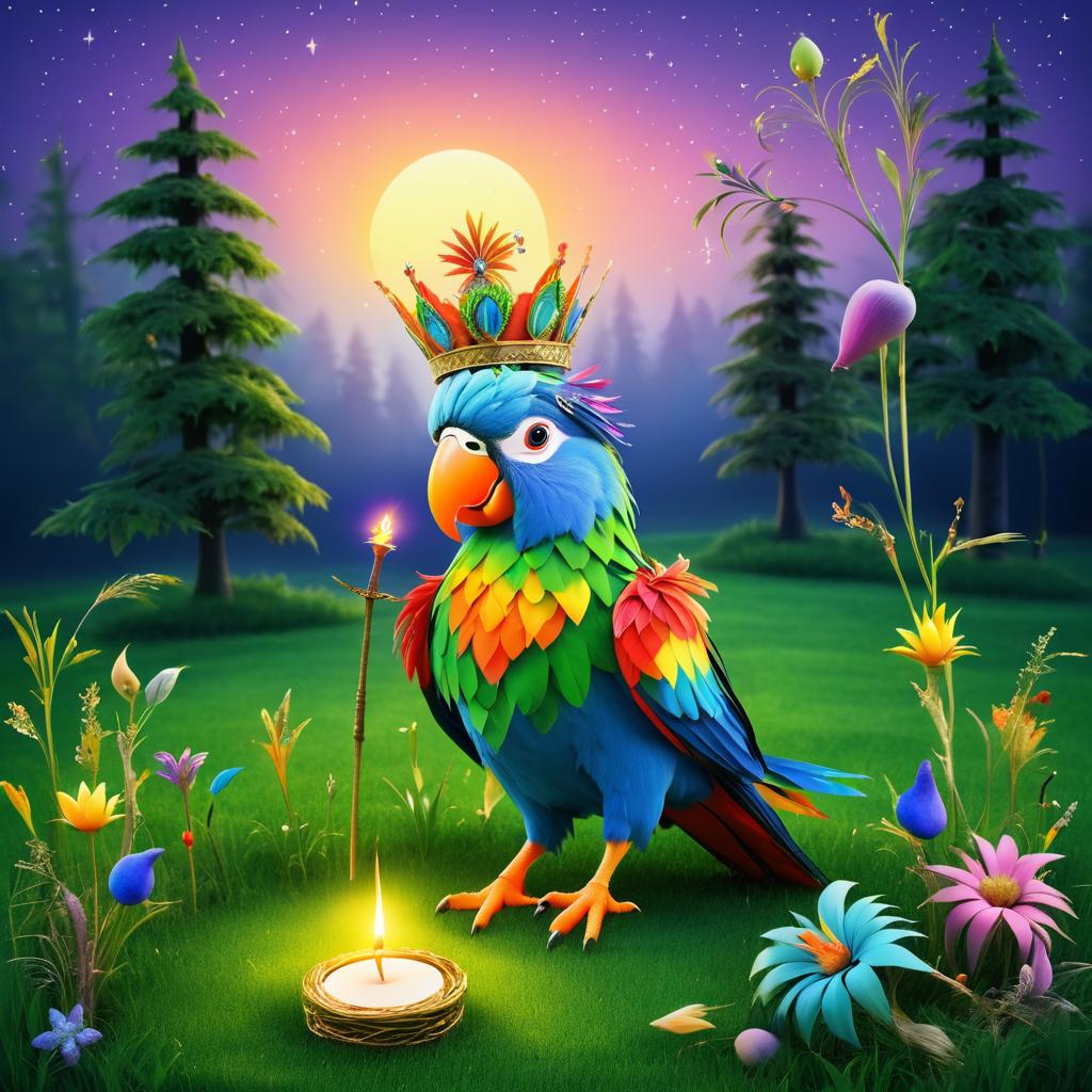 A whimsical scene with a parrot wearing a crown performing an incantation under a twilight meadow.