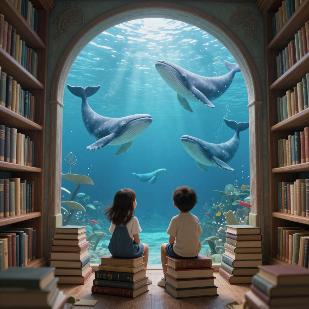 In a whimsical library where shelves of books frame a magical portal, two children perch on stacked volumes, gazing at a surreal underwater scene where whales gracefully swim through the air, defying gravity in a dreamlike, inverted ocean.