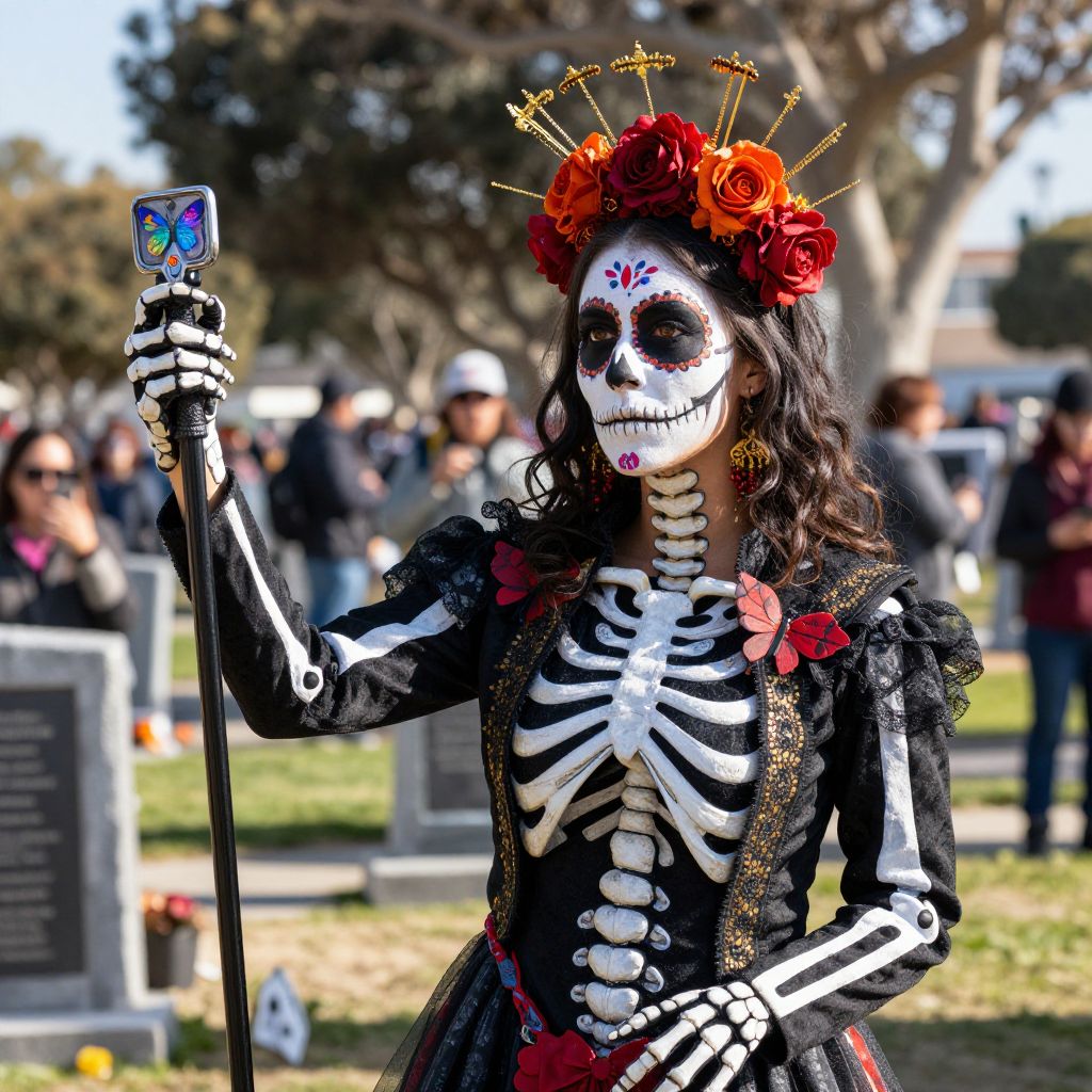 Photograph of a woman in a Day of the Dead costume, adorned with white face paint, red flower crown, orange butterfly accessories, and black skeleton
