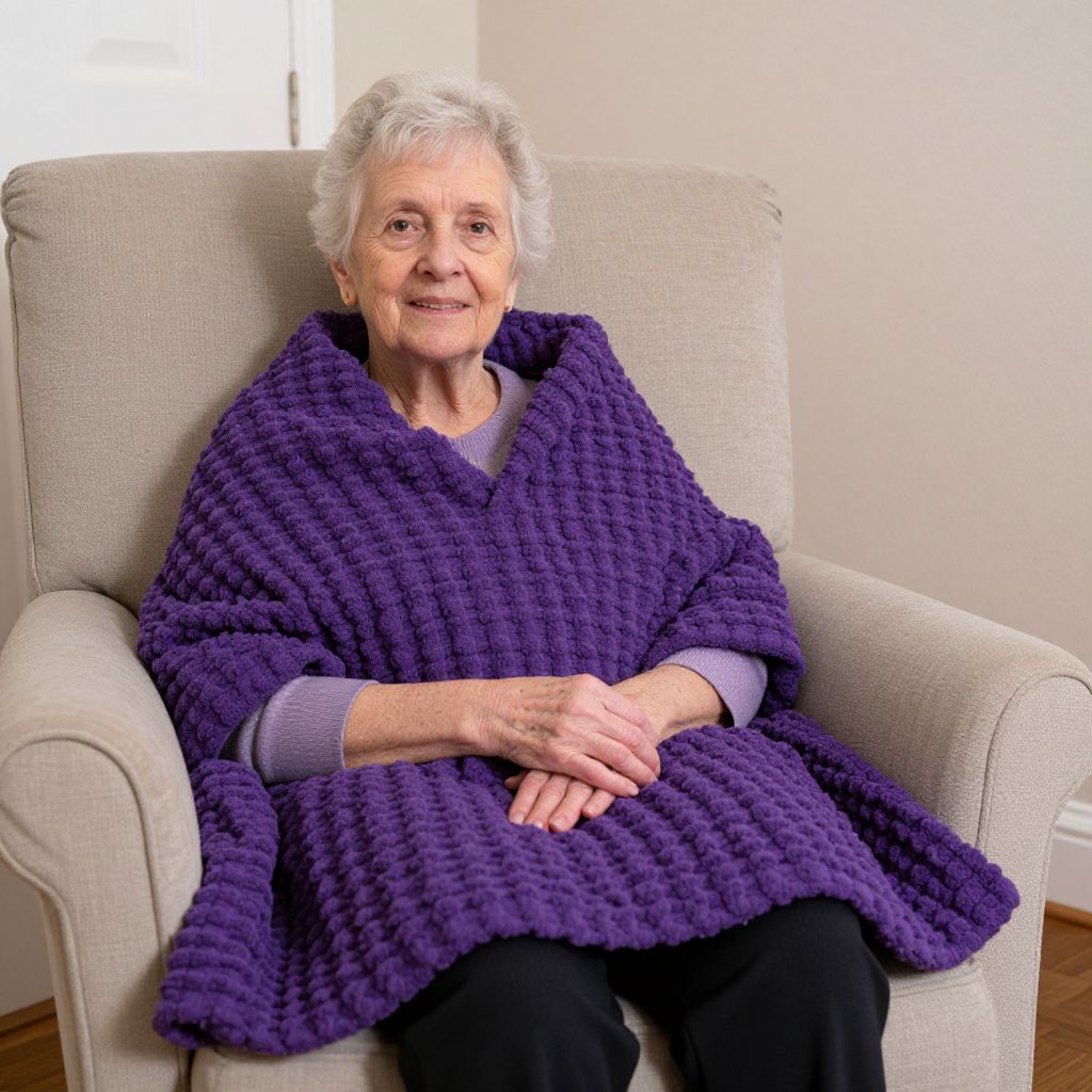 Photograph of an elderly woman with short, curly white hair, sitting in a light beige armchair. She is wearing a thick, textured, deep purple knitted shawl that covers her shoulders and lap, over a light gray long-sleeved shirt and black pants. She has a gentle smile, and her hands rest in her lap. The background is a plain white wall with a small window on the left, allowing natural light to illuminate the scene. The setting is simple and cozy, emphasizing the warmth and comfort of the shawl.