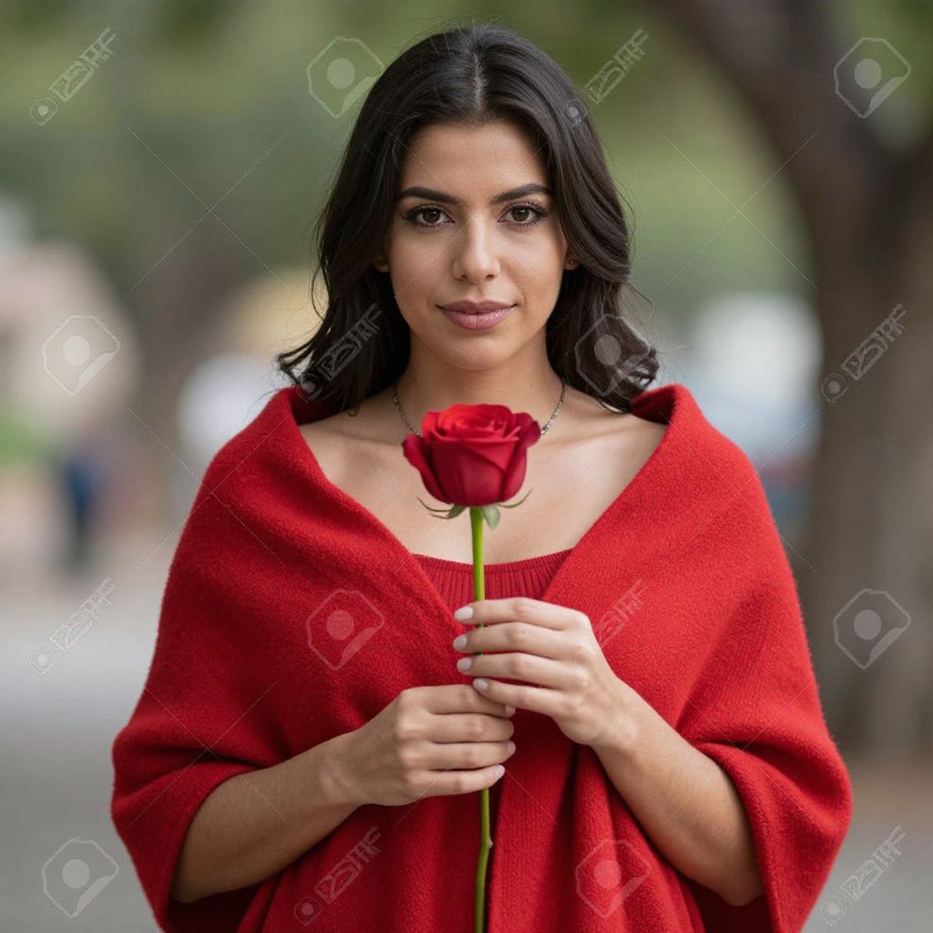 Photograph of a young woman with dark, wavy hair, wearing a red shawl, holding a red rose, standing outdoors with a blurred park