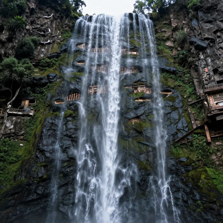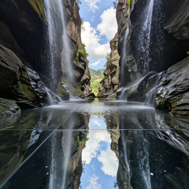 A mirror-lined canyon reflects the sky infinitely, fracturing light into gravity-defying waterfalls flowing in endless loops.