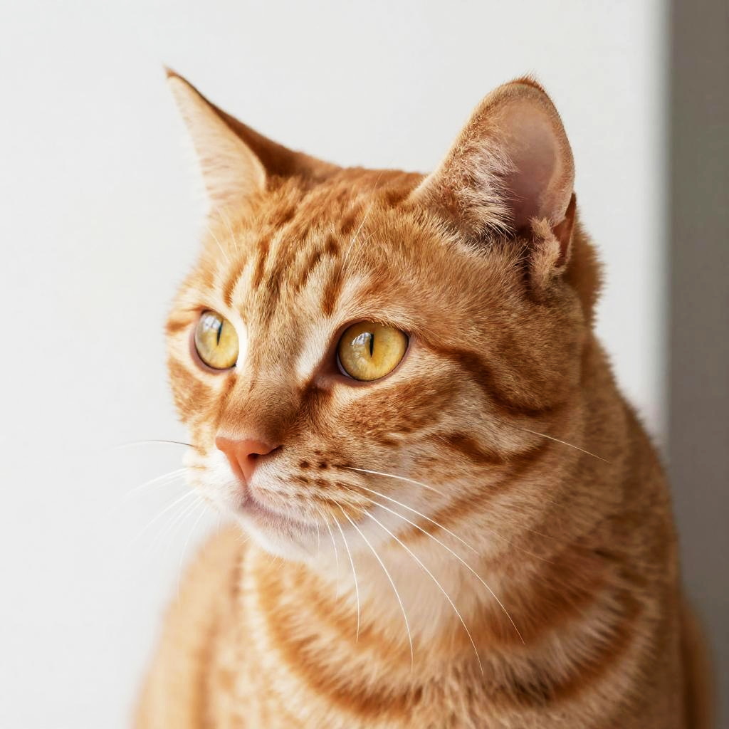 Photograph of an orange tabby cat with striking yellow-green eyes, short fur, and prominent dark stripes. The cat's head is turned slightly to the left, showing its right ear and profile. The background is a stark white, making the cat's orange fur and green eyes stand out vividly. The cat's whiskers are white and prominent, and its expression is calm yet alert. The lighting is bright, highlighting the texture of the cat's fur. The image is sharply focused on the cat's face, filling most of the frame.