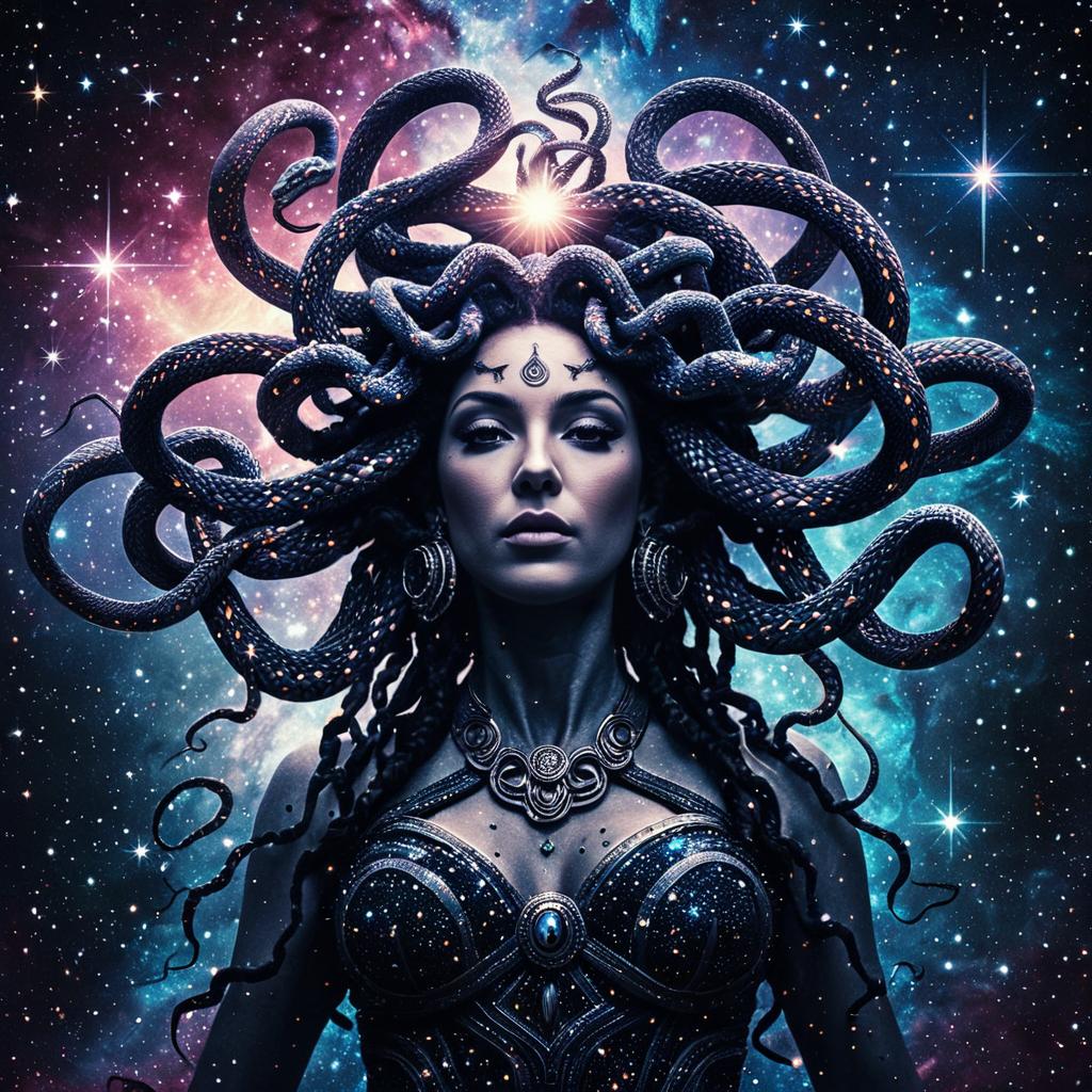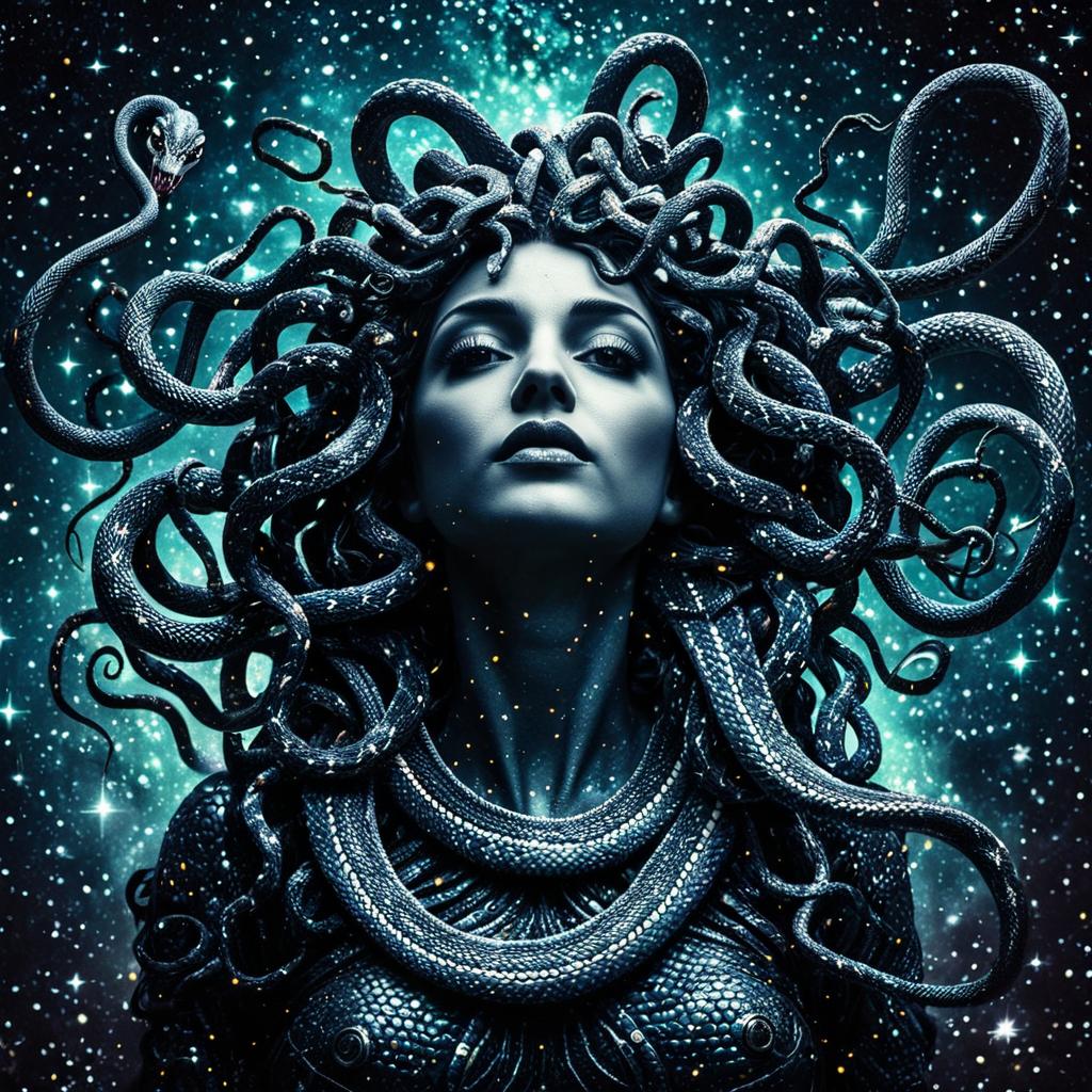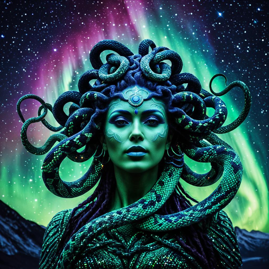 Medusa with long mad snakes in aurora borealis sky, glitter, nebula, stars.