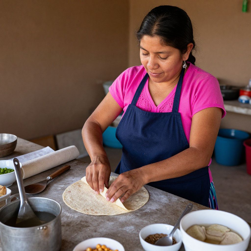 Natalia, a warm-hearted Mayan woman from the nearby town, skillfully shapes tortillas in a rustic kitchen setting, surrounded by simple cooking tools and ingredients, while wearing a vibrant pink shirt and a navy apron.