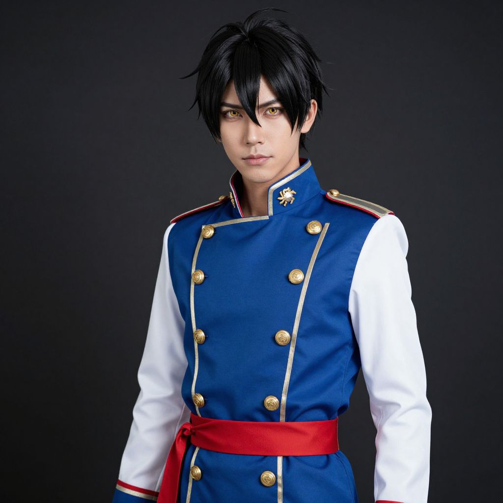 Photograph of a young man with pale skin and black, slightly messy hair, standing against a solid black background. He wears a blue military-style uniform with white sleeves and gold buttons, accented by a red sash tied around his waist. The uniform has epaulettes with gold trim on his shoulders. His golden eyes are intense and slightly narrowed, giving a serious expression. The lighting is even, highlighting the details of his outfit and face. The uniform's texture appears smooth, and the overall style is reminiscent of a fantasy or anime character.