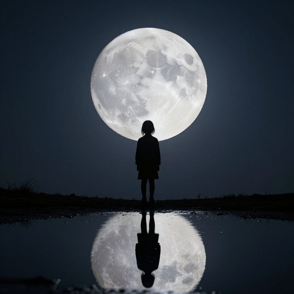 A solitary child stands beneath the luminous full moon, their silhouette mirrored in a reflective puddle below, evoking a profound sense of wonder and introspection, where the vastness of the cosmos meets the quiet depths of the soul.