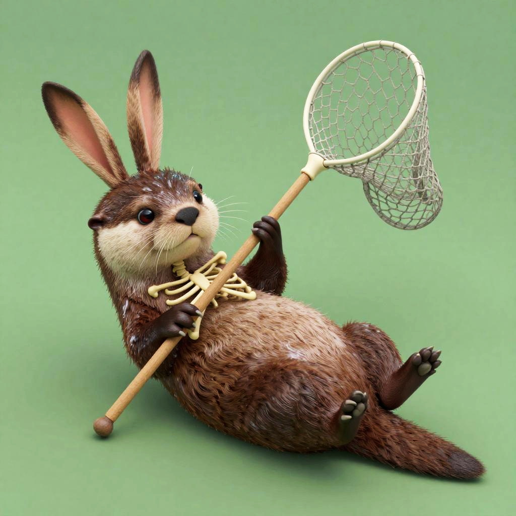 Full body, solo, anthropomorphic otter with glossy fur and playful dark eyes, rabbit ears, skeleton, ribs, animal, lounging on back with arms behind head, balancing a fishing net, green background