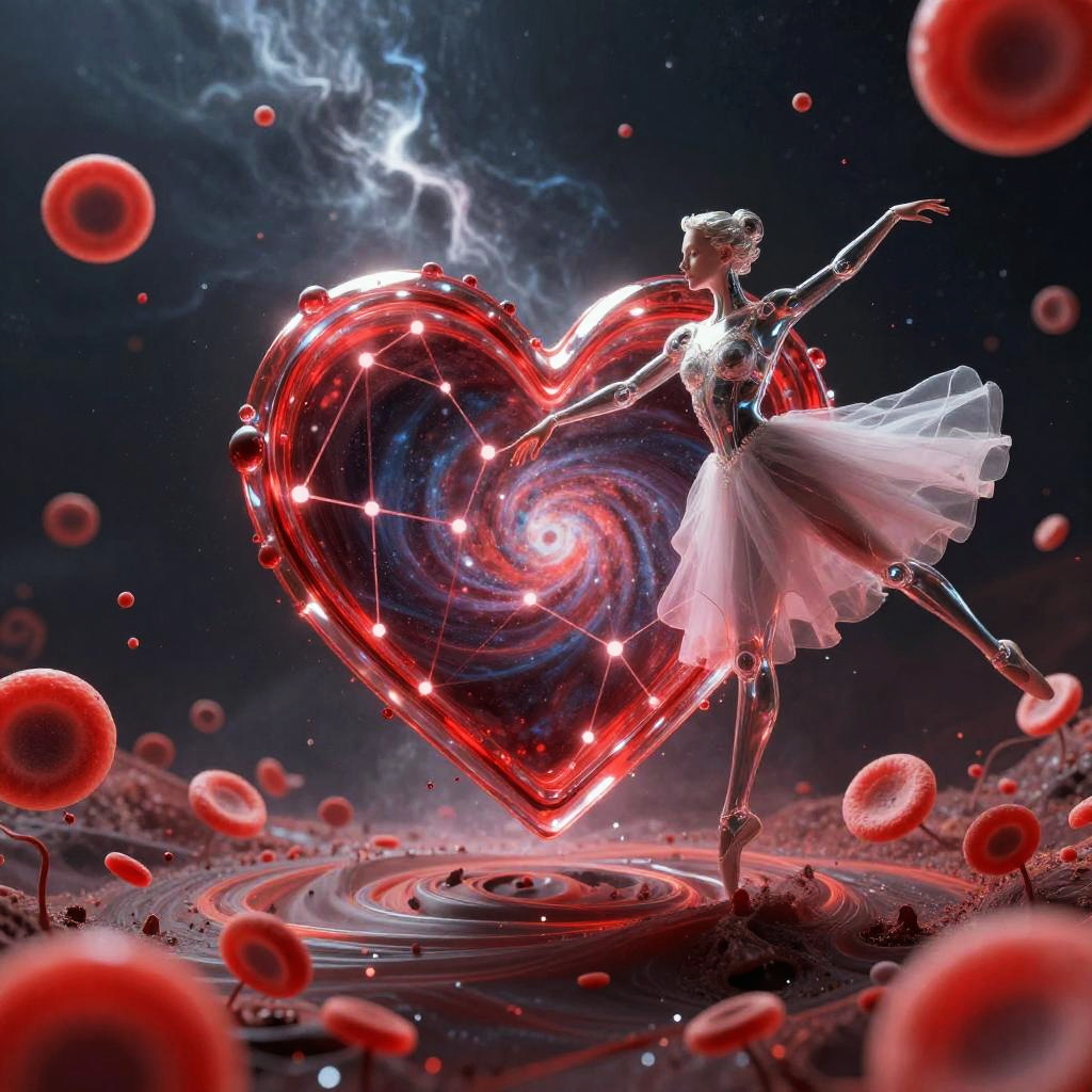 Ap0l0veh3art5 style, Valentine's Day in a Sci-Fi realm, visualized through a cosmic realism lens: In this futuristic odyssey, a couple, half-human and dressed in sophisticated formal attire from future eras, exhibit bodies that resemble a mesmerizing display of glass-like fragility. They tenderly connect through the ether, their fingertips grazing a heart-shaped constellation of red glass amidst an ocean of red blood cells. This heart is not ordinary; inside, it swirls like a nebula, a miniature galaxy of love, floating beneath the tranquil surface. Their ballet is a spectacle of beauty and fluidity, set against the backdrop of a cosmic storm's wrath. This narrative unfolds with elements of dramatic collapse and graceful descent, amidst a ballet of swirling particles, capturing the essence of mysterious and artistic love. Frozen in time, they are illuminated by ethereal light streaming through the clouds above, highlighting the nebula-like heart amidst the storm's fury, under a foreboding sky. The scene transforms into a breathtaking piece of cinematic art that celebrates the interstellar dance of love on Valentine's Day, combining elements of cosmic depth and realism.(geometrical:1.25), subscatter, translucent, (wind:1.15), (close-up:1.3)