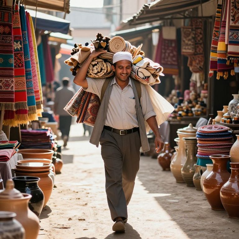 Photograph of a smiling Middle Eastern man in white hat and shirt, carrying colorful woven baskets and pottery, walking through a vibrant, sunlit market street