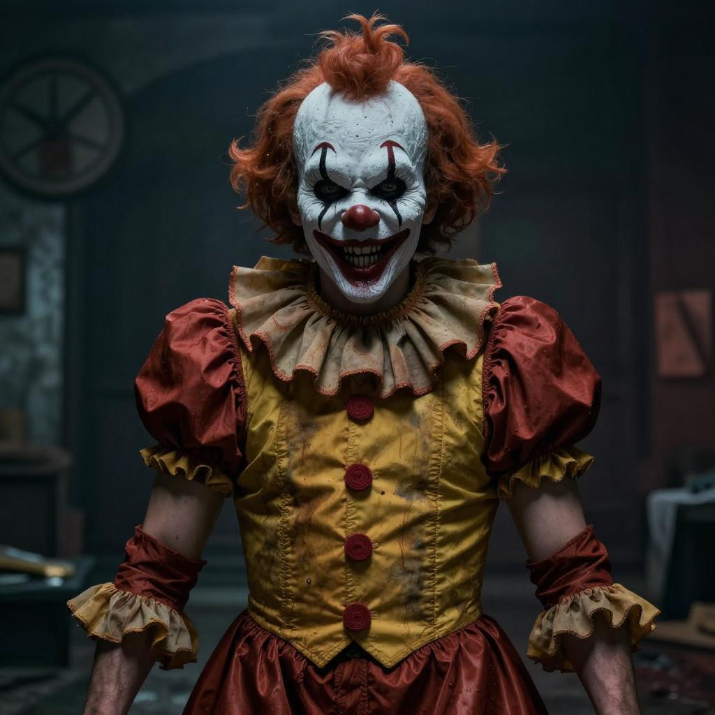 Photograph of a creepy clown in a yellow and red dress, white face paint with black eyes and red nose, in a dimly lit, eerie