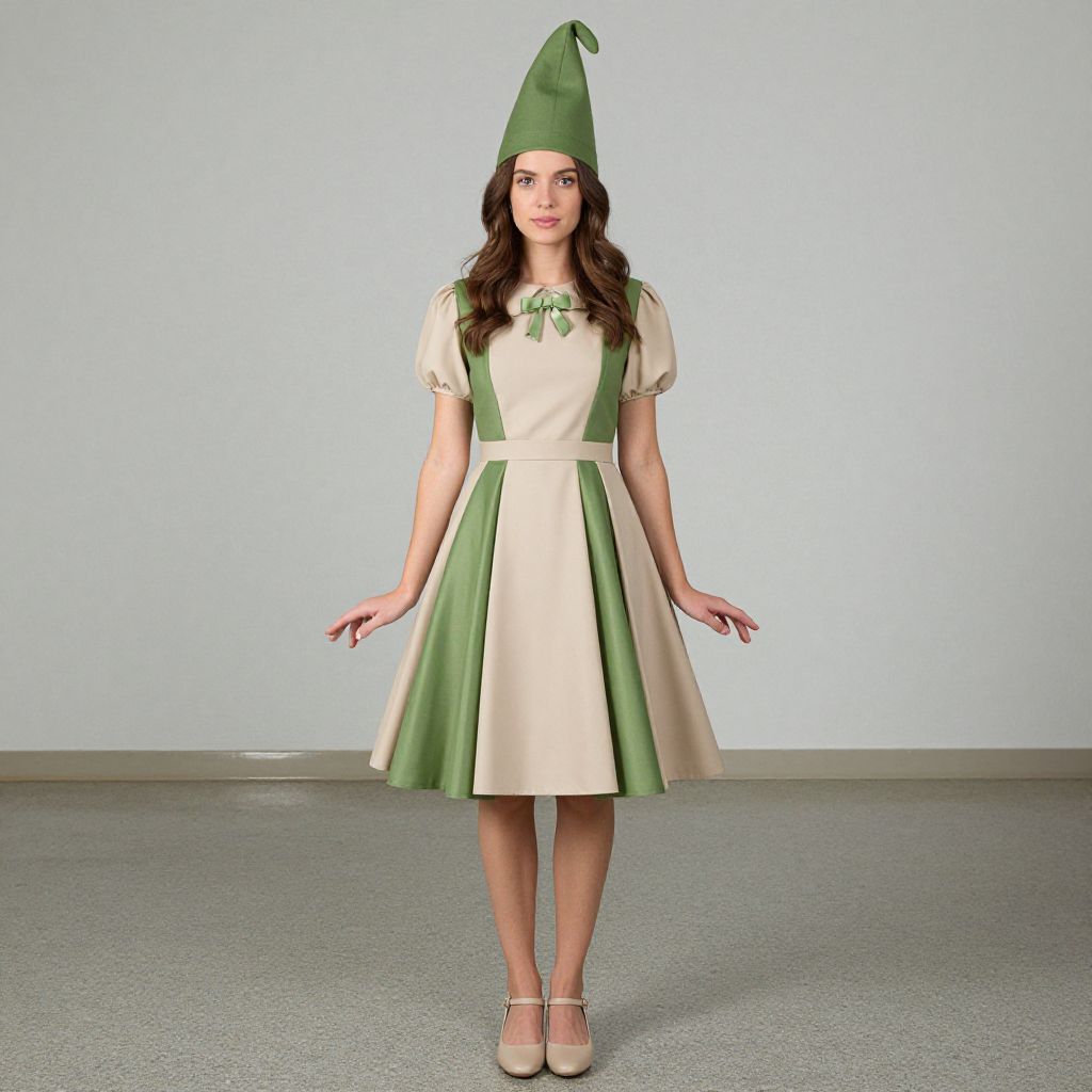 "Woman Forever Gnome Costume Dress, dressed in a green and beige dress and hat"