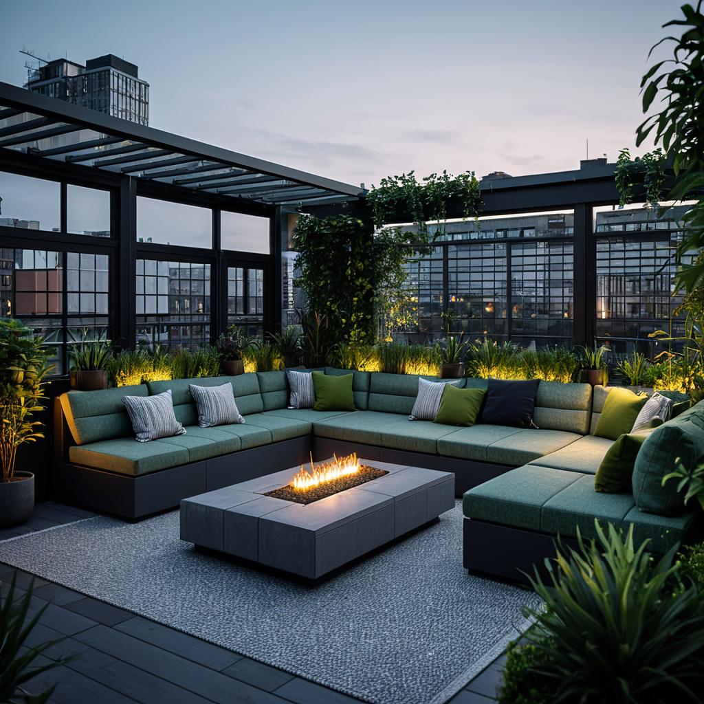 A photorealistic urban rooftop garden lounge during twilight featuring sleek, modern sectional furniture in green and gray tones with matching cushions. The lounge area includes a contemporary rectangular fire pit at the center, surrounded by lush green plants and decorative foliage. The space is framed by large windows and steel beams, with ambient lighting enhancing the cozy atmosphere and cityscape views in the background.