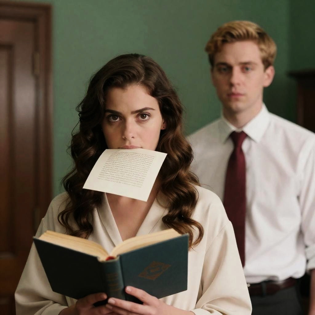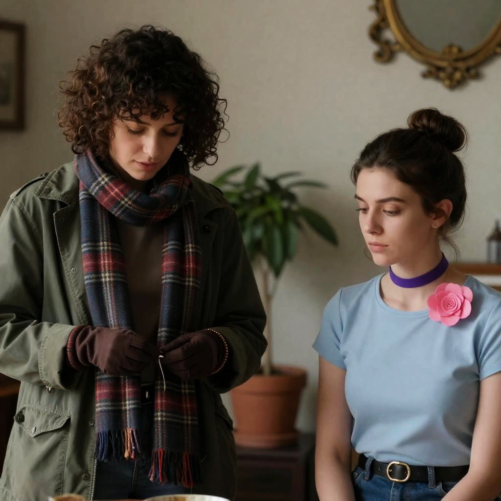 Photograph of two women in a dimly lit room. Foreground woman with dark hair, wearing a floral dress, reads a book at a table with a white lace cloth, purple flowers in a vase. Background woman with light brown hair, wearing a black dress with white collar, sits against a wooden cabinet. Table has a closed book with a leather cover. Light casts soft shadows.