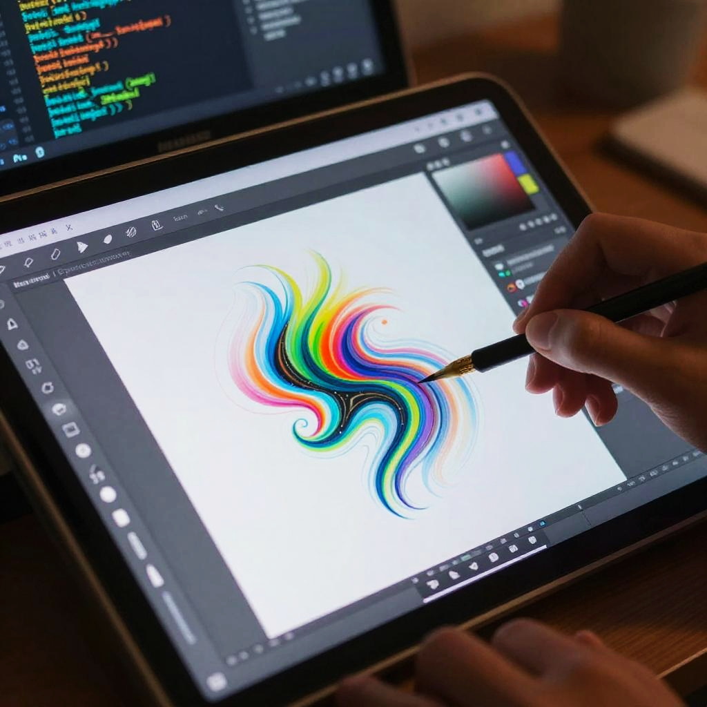 Close-up of an AI drawing creator software interface on a transparent screen, showcasing dynamic brush tools, real-time color blending, creative digital art evolving with fluid animations, high-tech workspace with floating code and design elements in the background.