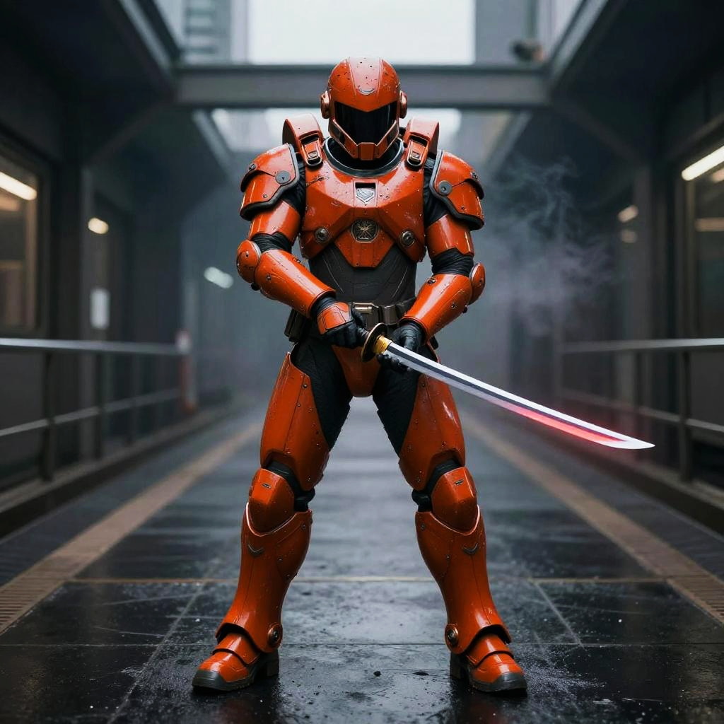 Cybernetic shaman wrapped in layered crimson and gold robes in digital sanctuary filled with arcing holographic sigils, poised with a gleaming katana catching a thin crimson sheen, soft warm illumination with spark trails carving micro-scratches and panel seams; reflective puddles, soft haze and drifting embers, balanced composition, strong contrast, ultrasharp photoreal cinematic realism, volumetric rays, shallow depth of field, crisp edges, realistic PBR materials, deep reds contrasted by cool teals, quiet intensity