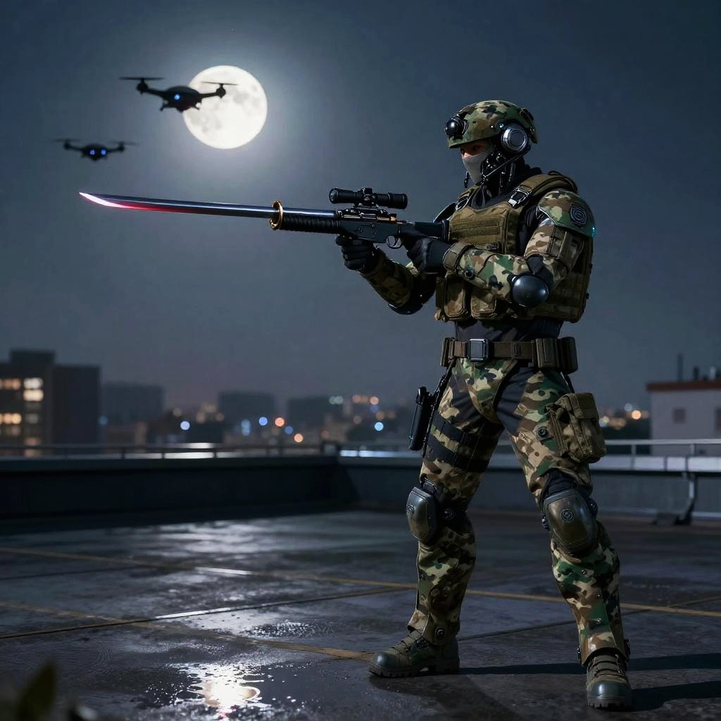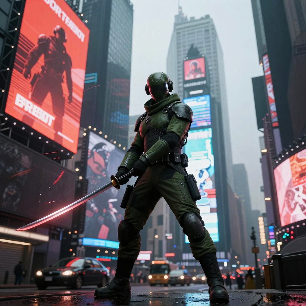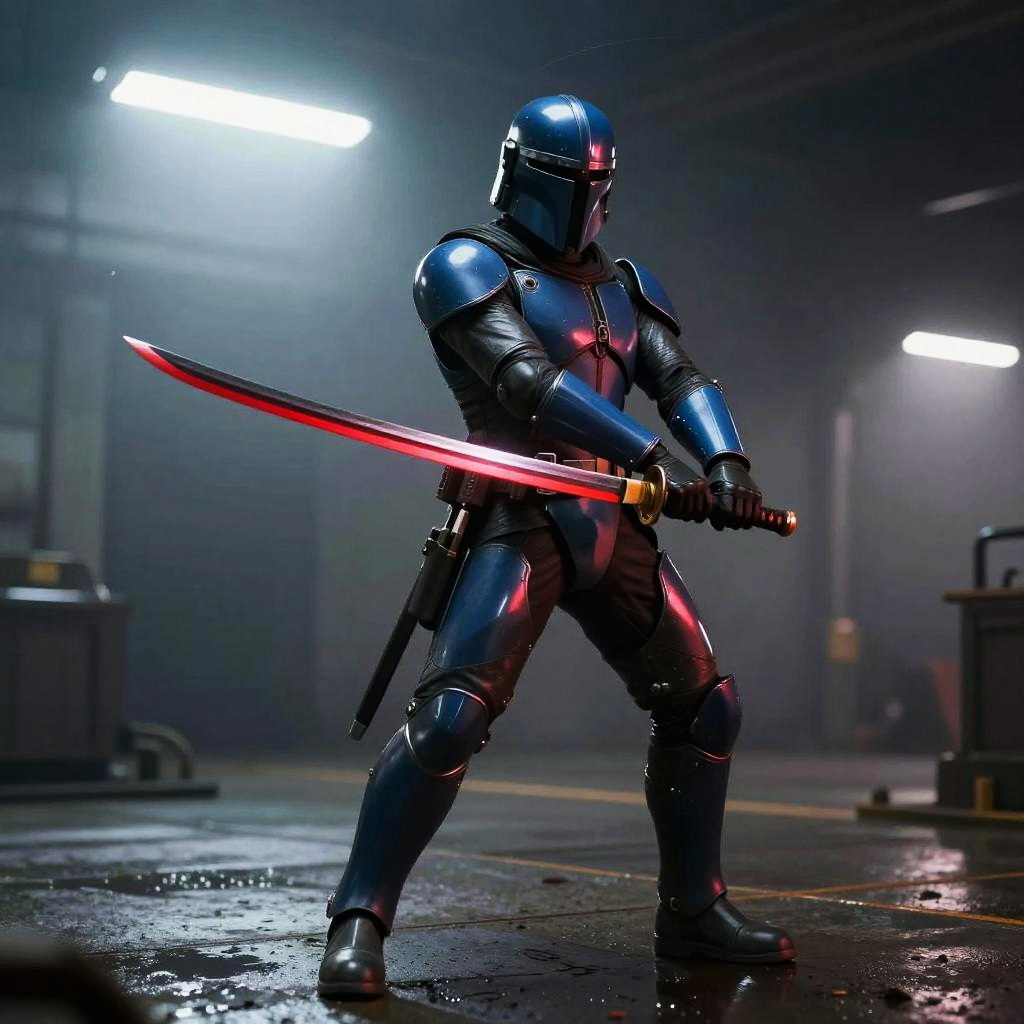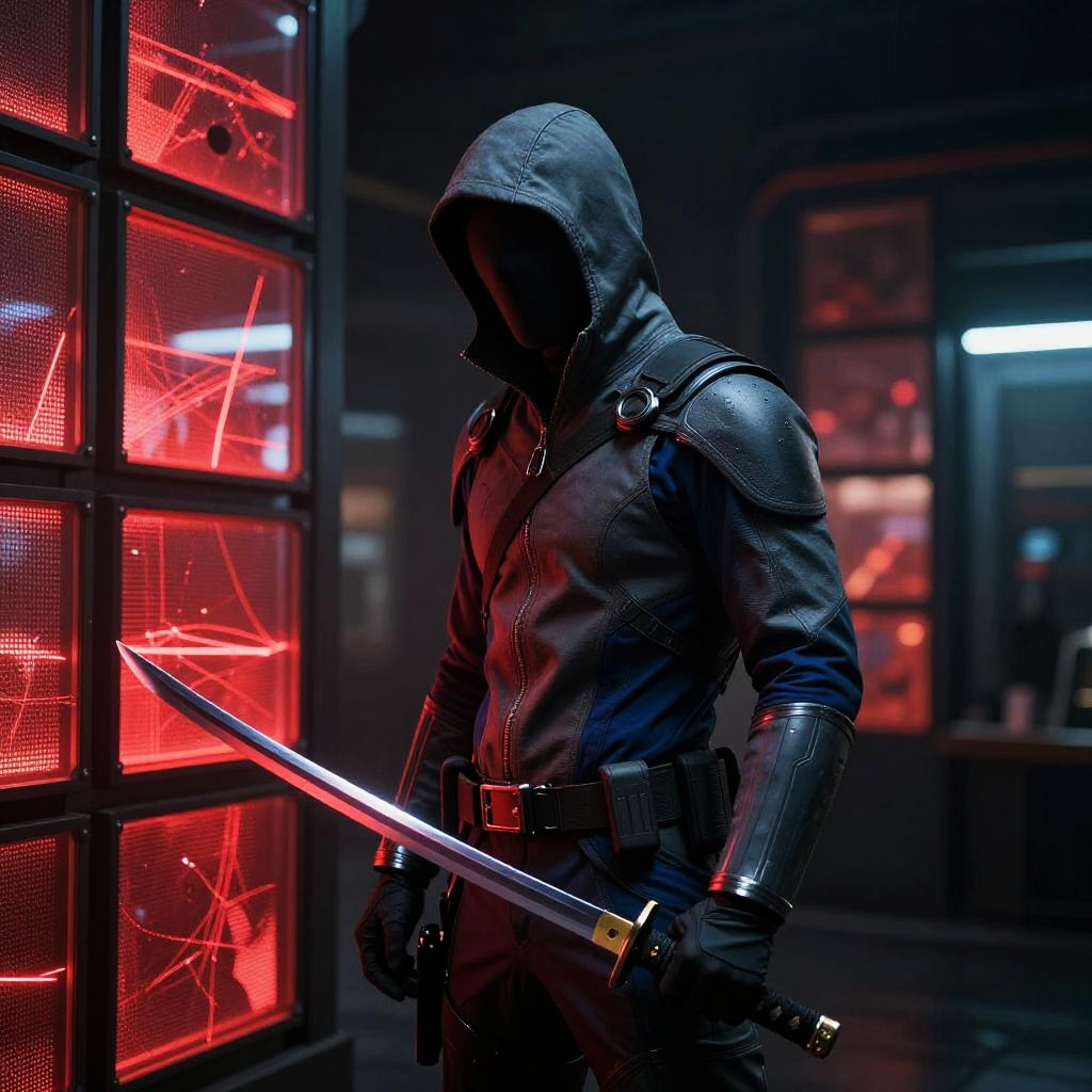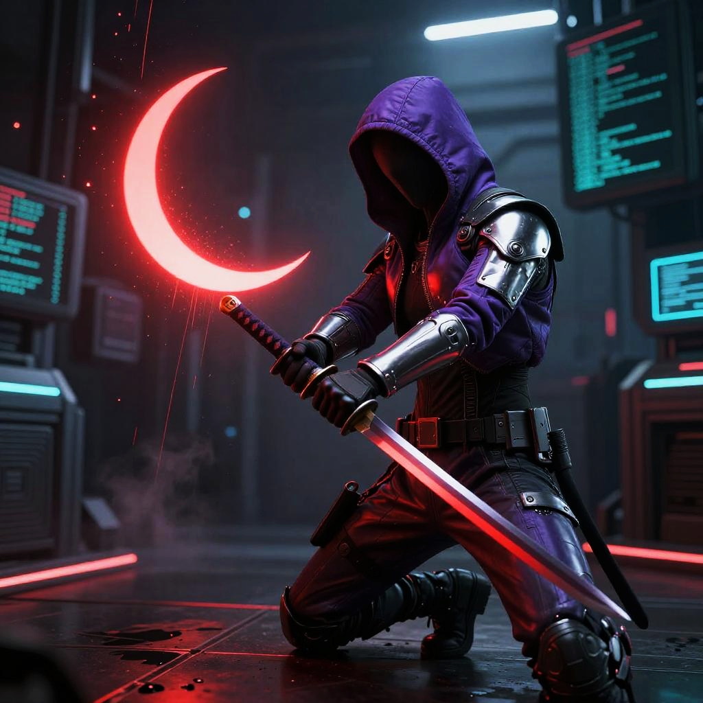 Cybernetic Shaman with Katana in Digital Sanctuary