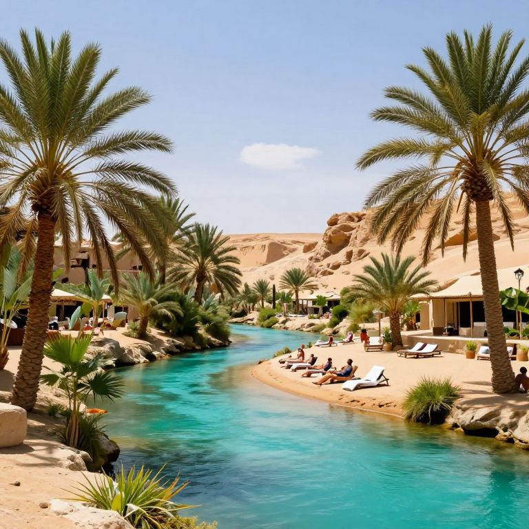 Lush palm trees flank a vibrant turquoise river winding through a serene desert oasis, where groups of people relax on sun loungers amidst sandy shores and rocky cliffs under a bright, cloud-dotted sky.