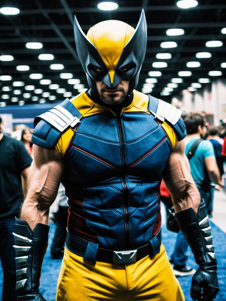 Candid portrait of a man dressed in a detailed yellow and black Wolverine costume with clenched fists, standing in a busy comic convention hall. The costume features a mask with pointed ears and metal claw gloves, capturing the iconic Marvel superhero look. The background shows other attendees and convention lights.