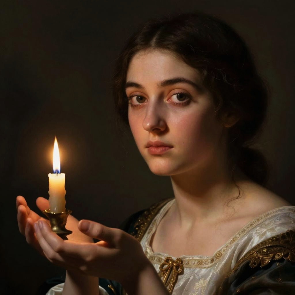Photorealistic digital artwork of a young woman with fair skin and dark hair, holding a lit candle, gazing intently, wearing an ornate