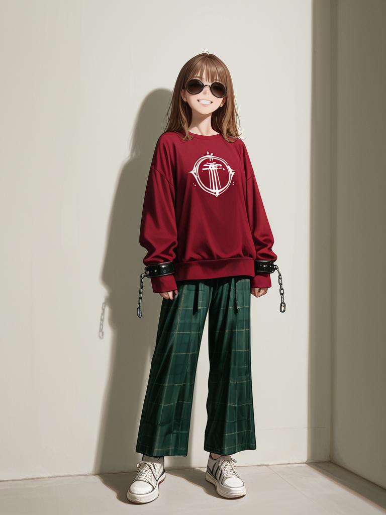 1girl, realistic face, full body shot, Woman, casual streetwear, burgundy crewneck sweatshirt with Champion logo, long sleeves, cuffed wrists, plaid high-waisted trousers in shades of brown, beige, and green, relaxed fit, straight leg, white lace-up sneakers, smiling, plain white studio background.