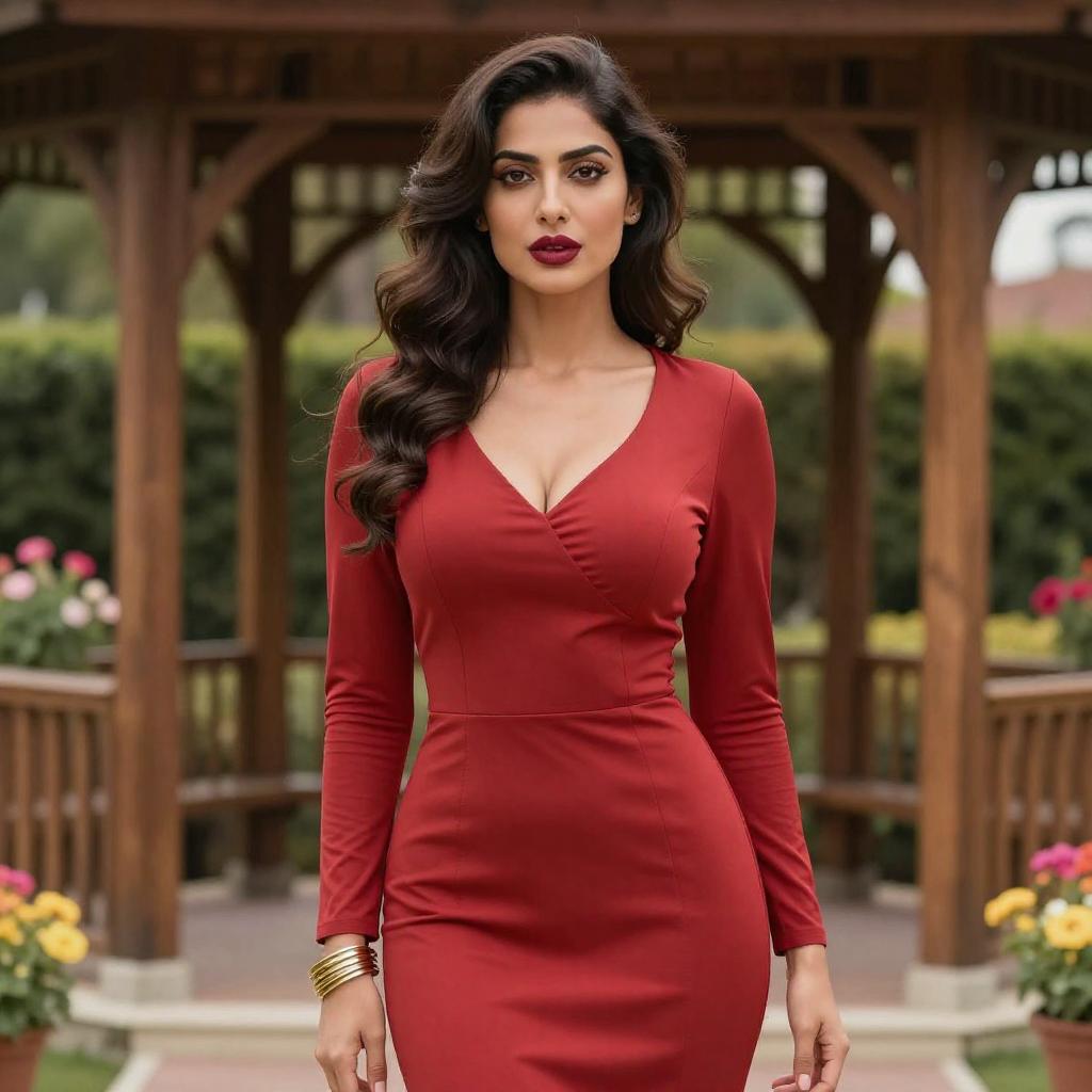 Photograph of a confident woman with long, wavy dark hair and medium skin tone, wearing a form-fitting, long-sleeved, deep red dress with a v-neckline that accentuates her ample cleavage. She has bold red lipstick, dark eye makeup, and is wearing gold bangles on her right wrist. She stands in front of a wooden gazebo with green hedges and colorful flowers in the background, creating a vibrant and elegant outdoor setting. The image has a slightly edited, enhanced aesthetic.