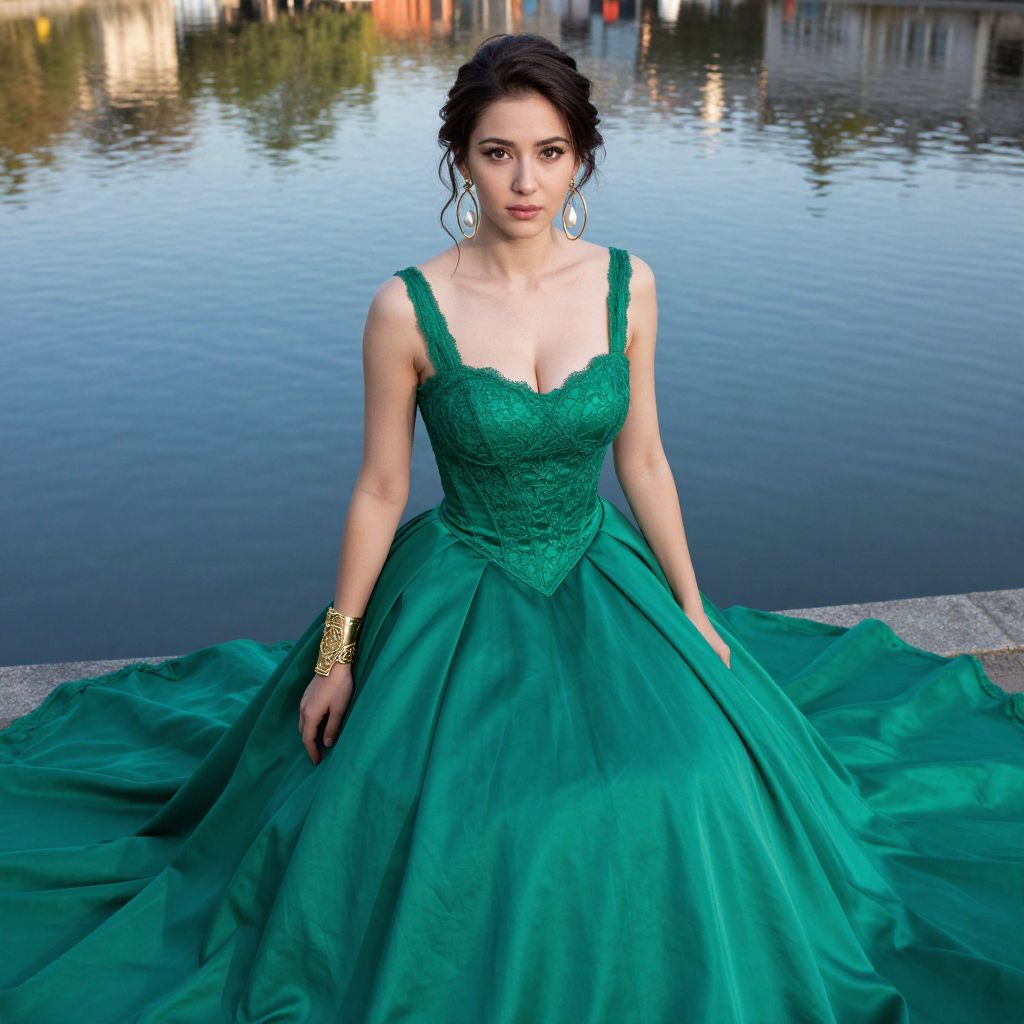 Photograph of a young woman with fair skin and dark, wavy hair in an updo, wearing an emerald green, lace-embellished, sleeveless ball gown with a deep V-neck and a full, voluminous skirt. She stands on a stone edge by a calm, reflective water body, with city buildings and lights in the blurred background. She has red lipstick and wears a gold bracelet on her right wrist. The dress's texture contrasts with the smooth water and stone, creating a visually striking image. The lighting highlights her figure and the dress's details.
