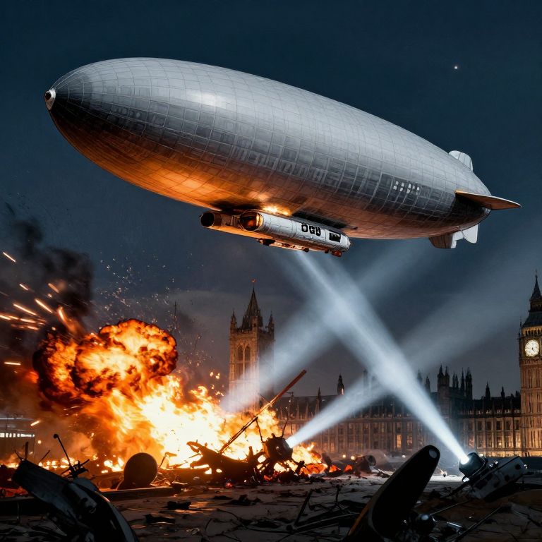 Drawing Ink Zeppelin airship, flying over London, burning, crashing, falling, searchlighhts, night time, bombing, explosions, war, hyper realistic,