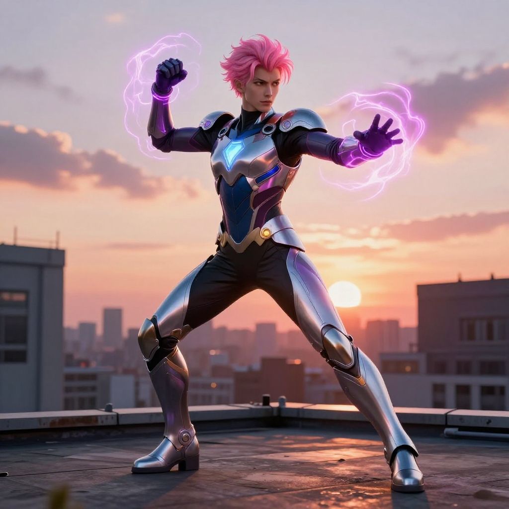 Superhero with pink hair wearing a futuristic armor, standing on a city rooftop at sunset, dynamic pose, glowing energy effects, vibrant color palette, cinematic lighting