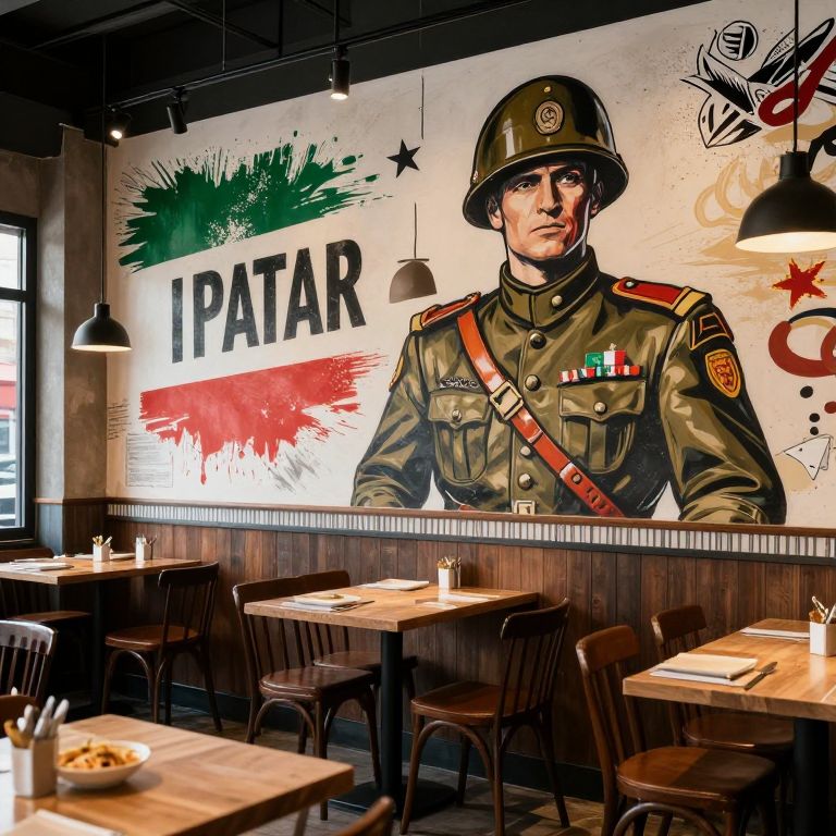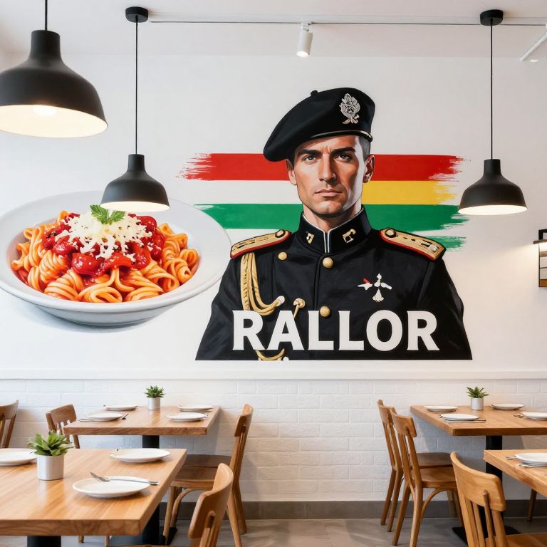 The image depicts a modern, hip Italian fast food restaurant with a trendy, white-themed interior. The focal point is a large, striking mural of an Italian soldier, dressed in a traditional uniform with a beret, set against a background of vibrant, colorful stripes. The soldier's name, \"RALLOR,\" is prominently displayed below his image. To the left of the mural, a large, appetizing depiction of a pasta dish with tomato sauce and cheese is showcased, adding a culinary element to the artwork. The restaurant features several wooden tables and chairs arranged neatly, with white plates and cutlery on each table, suggesting a clean and inviting dining area. The walls are adorned with brick-like textures, and the lighting is modern, with hanging black pendant lights providing a contemporary touch. The overall composition is well-balanced, with the soldier mural and pasta image creating a cohesive and visually appealing atmosphere.