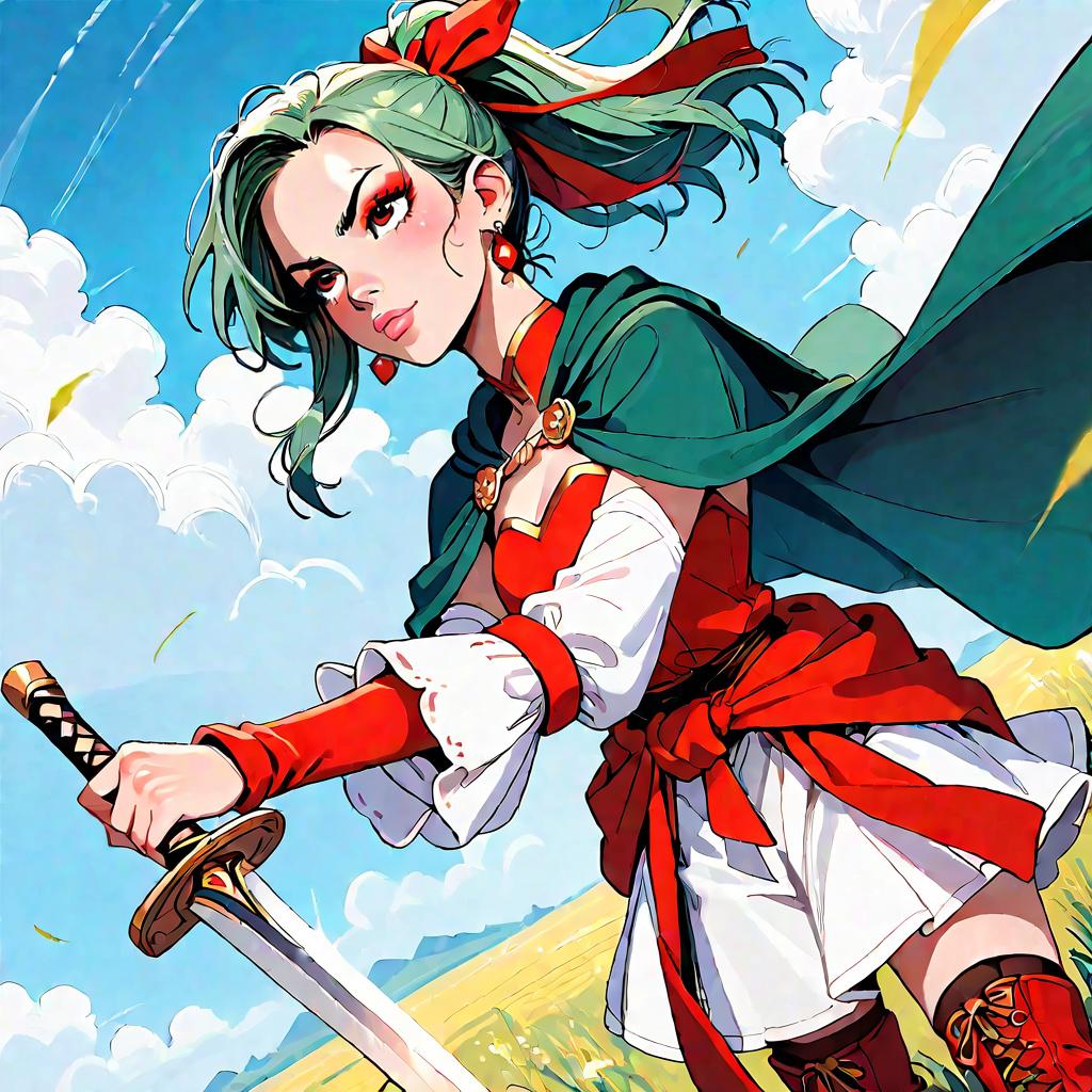 Score_9, score_8_up, source_anime, 1girl, green hair, ponytail, hair ribbon, earrings, cape, red dress, strapless, detached sleeves, clothes around waist, print legwear, field, blue sky, determined, dutch angle, holding sword, looking up, closed mouth, red boots, standing