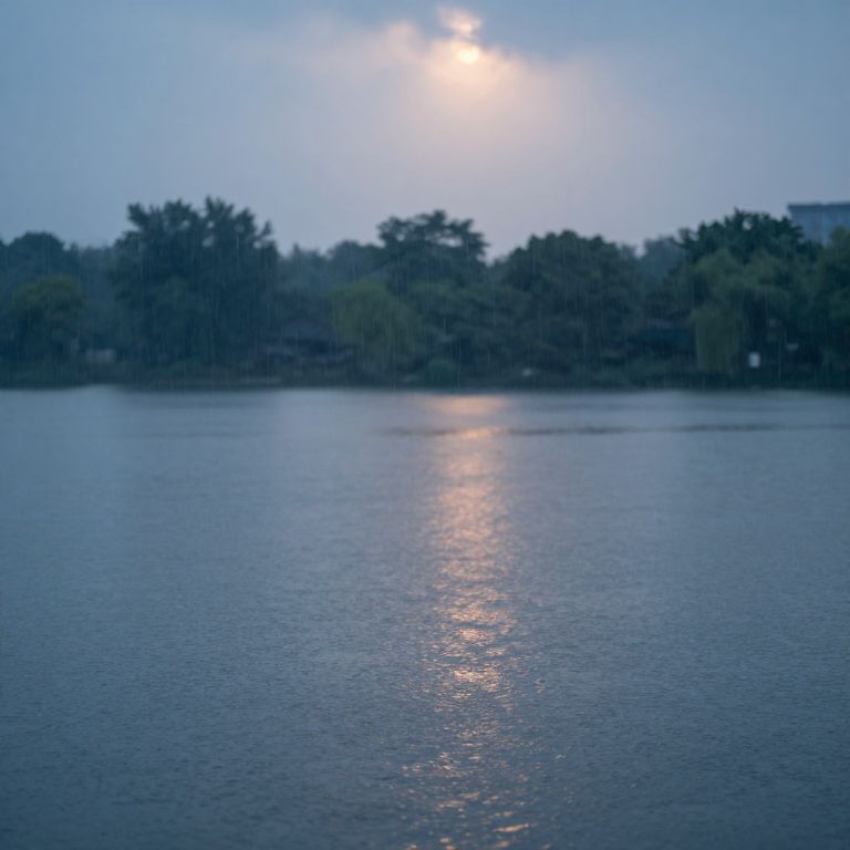 Rainymood scene with gentle raindrops falling on a calm lake at twilight, soft reflections on the water surface, misty background with silhouettes of trees, cozy atmosphere, muted blue and gray tones, peaceful and tranquil ambiance