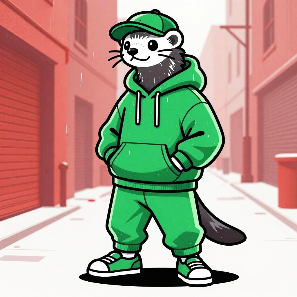Realistic photo. A vibrant cartoon illustration of a chrome-plated ferret rapper at in rain-soaked city alley, bold black outlines, clean cel shading, crisp cutout edges; oversized hoodie, tapered joggers, slip-on shoes, cap and wristbands. Relaxed, expressive pose, confident tilt, exaggerated proportions, chunky silhouette; modern, slightly abstract shapes, minimal clutter; simple gradient backdrop, tidy shadows, soft rim light. Dominant emerald green and radiant red with high-contrast accents; playful retro hip-hop vibe, halftone speckles, subtle paper grain.