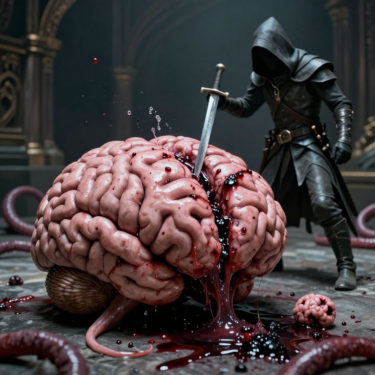 Cinematic photo, Image is a digital painting featuring a fantasy-themed scene of a massive limbless, slimy pinkish-gray & faceless brain, filling half the room, The brain lies dying on the floor like a burst balloon, The brain is split down the midline/corpus callosum, the mangled halves divided by a gaping wound, Clear fluid jets out from several wounds and the dying brain spills bloody ichor, globs of brain matter and splattery black-brown gore on the gray stone floor, Severed mauve tentacles litter the chamber, The brain-slayer is a hooded, slim swashbuckler/rogue in the mold of Hawkmoon and the Gray Mouser stands looking down on the squashed brain after a fierce battle, He has just slain a giant disembodied Elder Brain, his curved sword still piercing its deflating cerebrum in its pool, The hood hides his features in darkness, He is clad in battle-worn gray leather long breeches and cuirass with supple boots and crossed bandoliers, A Fabulous trove awaits the victor, lighting on the subject, 35mm photograph, film, bokeh, professional