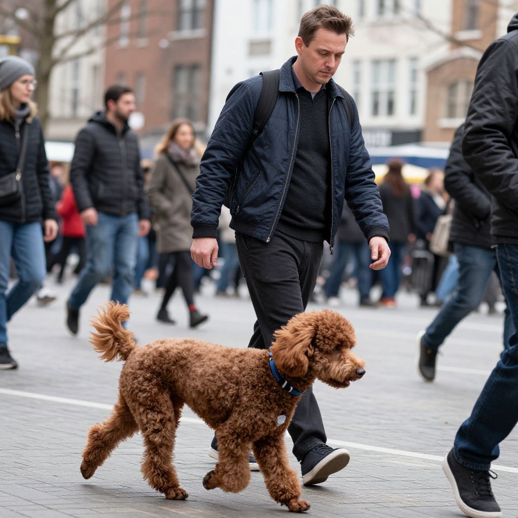 [[man,brown poodle]]Captivating scene: A skewed shot captures a man walking his brown poodle through a busy urban landscape, showcasing the dynamic energy and unique perspective of their adventure. Vivid colors, blurred faces in the background, and an intriguing angle create an immersive experience. The subject's determined stride, the dog's playful tail wagging, and the city's fren Man has masculine face and piercing eyes